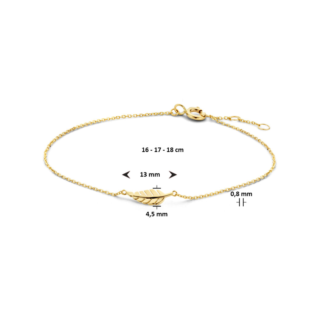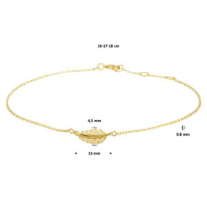 Trendy geelgouden anker armband met een schakelbreedte van 0.8mm. Uitgevoerd met een poli afgewerkte veer van 4.5x13mm en met draaglengtes van 16, 17 en 18cm. Deze armband is te combineren met bijpassende sieraden uit onze collectie en zo maak je gemakkelijk een trendy set. Tip: Leuk om kado te geven!