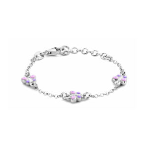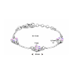 Deze leuke Zilveren Kinderarmband met 3 Vlinders Roze is vervaardigd uit gepolijst 925 Sterling zilver, dat is voorzien van een gerhodineerde coating. De armband is opgebouwd uit Jasseron schakels met een schakelbreedte van 1,7 mm en heeft een metaalgewicht van 2,37 gram. De draaglengte van deze armband is 11 cm met een extensie van 2 cm. Op 3 plaatsen van de kinderarmband is een lichtroze met paars emaille vlinder bevestigd met een hoogte van 7 mm en een breedte van 10 mm. De armband wordt gesloten met een karabijnsluiting.