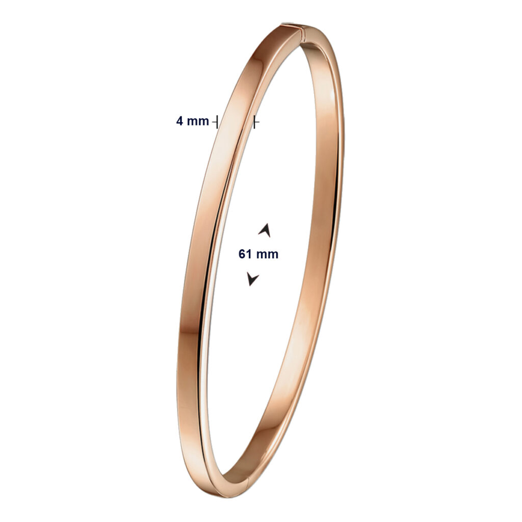 Deze rosé gouden slaven armband van 925 zilver met een luxe 14 karaat rosegouden afwerking heeft een massieve ovale buisstructuur. De armband heeft een breedte van 4 mm en is verkrijgbaar in de diameter van 61 mm. Het massieve scharnier zorgt voor een stevige, maar gemakkelijke sluiting. De bangle armband is een luxe sieraad dat direct de aandacht trekt en een chique uitstraling geeft.