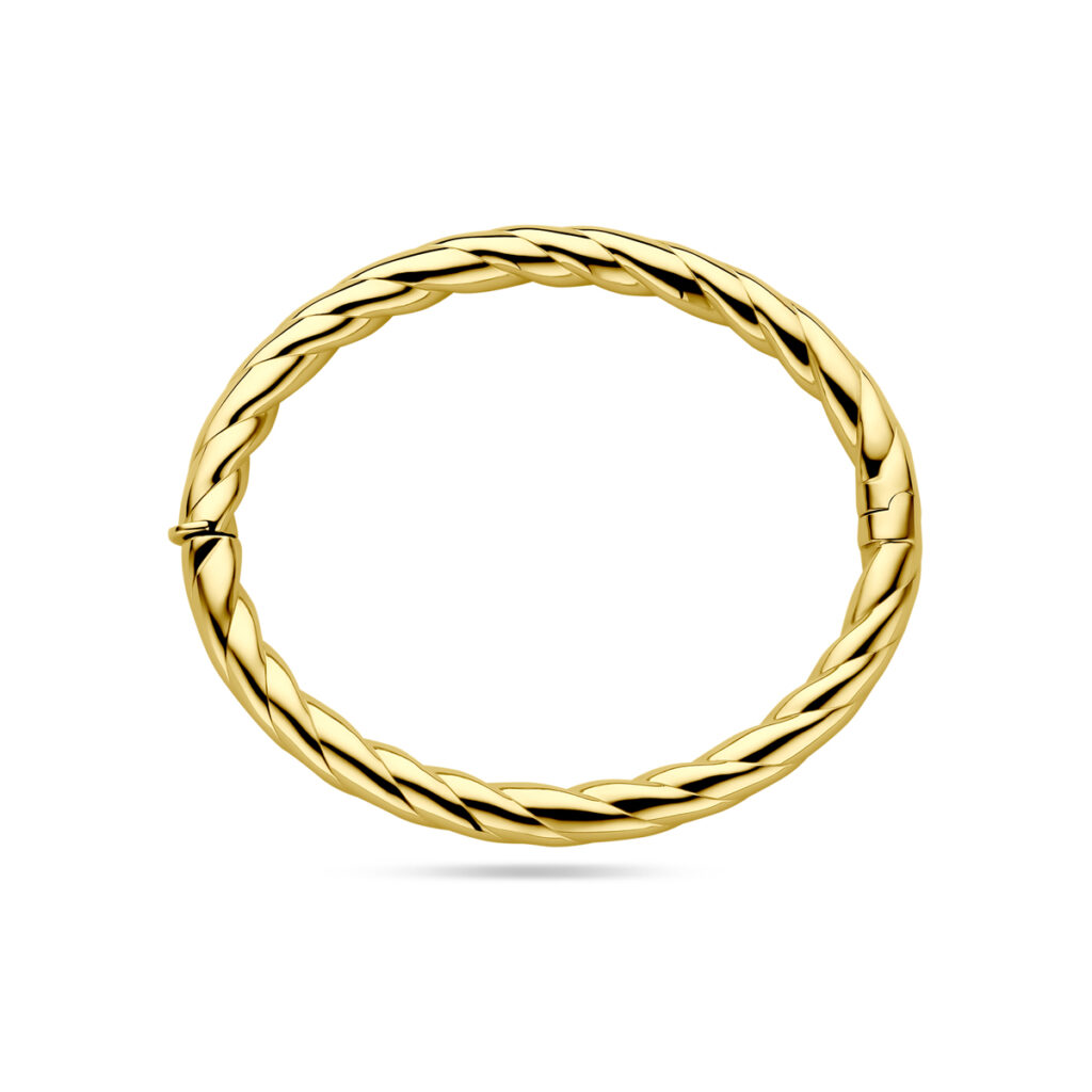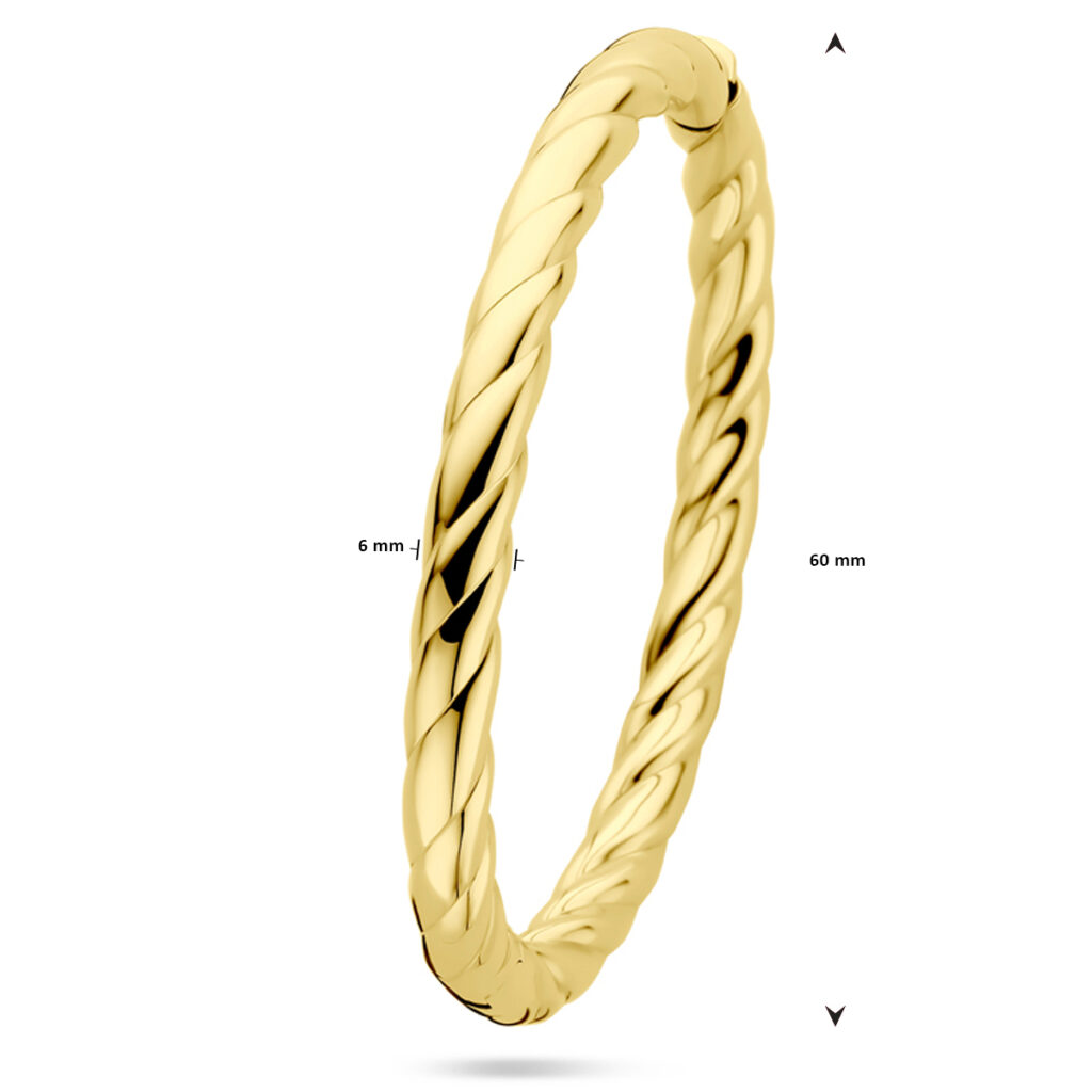 14k Geelgouden bangle uitgevoerd met een gedraaide buis. De bangle heeft een totale diameter van 60mm.