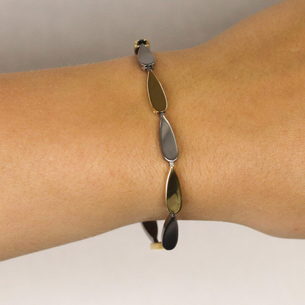 Deze unieke titanium armband van Boccia met nr: 03052-02 is een stijlvolle toevoeging aan je sieradencollectie! Wat deze armband bijzonder maakt, zijn de bicolor schakels: een combinatie van zilverkleurige en goudkleurige druppelvormige schakels, die een mooie balans tussen matte en glanzende afwerkingen creëren. De schakels zijn sierlijk in de lengte aan elkaar verbonden en de armband sluit met een stevige karabijnsluiting. Met een lengte van 22 cm is deze armband perfect voor een verfijnde en elegante look. Deze armband kan ook ideaal dienen als een van onze vriendschapsarmbandjes, een prachtig symbool van verbondenheid en stijl. Combineer de armband met het bijpassende collier en oorbellen voor een complete en harmonieuze look.