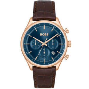Dit bruine BOSS GREGOR Lederen Herenhorloge bestaat uit een ronde horlogekast die is uitgevoerd in rosé goudkleurig staal met een diameter van 45 mm en een dikte van 11,8 mm bij een gewicht van 319 gram. De horlogeband is vervaardigd uit bruin leer, dat is voorzien van krokodillenleren print en heeft een aanzetmaat van 22 mm en is voorzien van een rosé goudkleurige gespsluiting die is voorzien van het BOSS merk. Het Quartz uurwerk werkt op batterijen. Het uurwerk van het merk VR32B is beschermd door mineraalglas, dat zeer hard is en vrijwel krasvrij. De tijdsweergave wordt op de blauwe wijzerplaat analoog weergegeven. Dit BOSS heren horloge met multifunctie is voorzien van datumaanduiding. Daarbij is dit horloge tot 5 ATM spatwaterdicht, wat ook – samen met het BOSS merk – op de achterkant van de horlogekast staat vermeld.