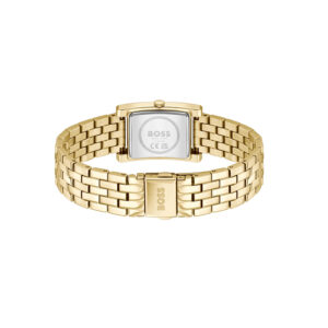 Dit BOSS horloge uit de LUCY serie met artikelnr: HB1502744 heeft een chique look. Zeer geschikt voor de moderne stijlvolle vrouw van nu. Het goudkleurige dameshorloge valt op door zijn stalen rechthoekige horlogekast met een goudkleurige wijzerplaat met minimalistische wijzers. Aan de kast zit een goudkleurige schakelband met kliksluiting. De kast van het horloge heeft een afmeting van 22×24,5mm met mineraalglas en is 3ATM.