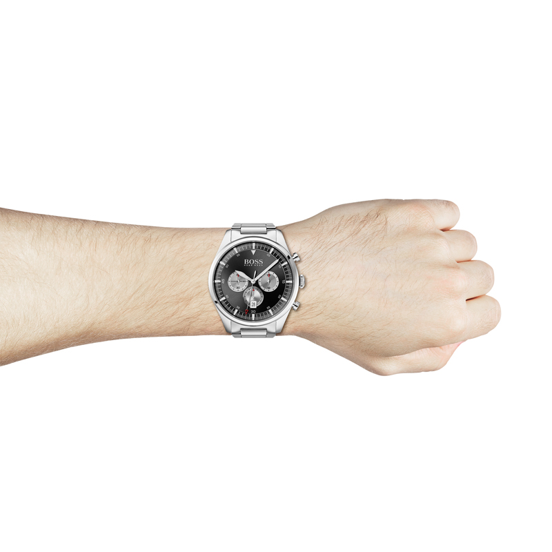 Dit horloge bestaat uit een zilverkleurige kast van edelstaal met een diameter van 44mm. De wijzerplaat heeft een mooie zwarte kleur met zilverkleurige streepjes als tijdsaanduidingen en zilverkleurige wijzers. Bovenin is de wijzerplaat voorzien van het woord BOSS HUGO BOSS in zilverkleur. Verder is de wijzerplaat voorzien van drie kleinere wijzers, waarbij de linker de seconden per minuut aangeeft, de middelste de dagen van de maand aangeeft en de rechter de uren per dag aangeeft. De horlogeband bij dit mooie horloge bestaat uit meerdere edelstalen schakels met een mooie zilverkleur. Aan de achterkant zit een handige klepsluiting, waardoor u dit horloge gemakkelijk om- en afdoet. Dit horloge is afkomstig van het merk Boss Hugo Boss en speciaal ontworpen voor heren. Het merk Boss Hugo Boss is een wereldwijd bekend merk dat mannen en vrouwen al jarenlang voorziet van de mooiste kleding en accessoires voor elke gelegenheid. Koop vandaag nog uw eigen Boss Hugo Boss sieraad!