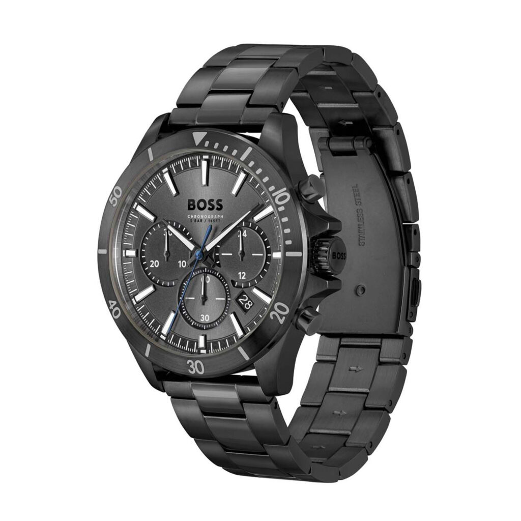 Dit zwarte BOSS TROPER Zwart Stalen Herenhorloge bestaat uit een ronde horlogekast die is uitgevoerd in zwart staal met een diameter van 44 mm en een dikte van 11,2 mm bij een gewicht van 319 gram. De horlogeband is vervaardigd uit robuuste schakels van zwart staal en heeft een aanzetmaat van 22 mm en is voorzien van een vlindersluiting die is voorzien van het BOSS merk. Het Quartz uurwerk werkt op batterijen. Het uurwerk van het merk VR32B is beschermd door mineraalglas, dat zeer hard is en vrijwel krasvrij. De tijdsweergave wordt op de grijze wijzerplaat analoog weergegeven. Dit horloge met multifunctie is voorzien van datumaanduiding. Daarbij is dit horloge tot 5 ATM spatwaterdicht, wat ook – samen met het BOSS merk – op de achterkant van de horlogekast staat vermeld.