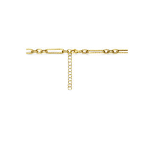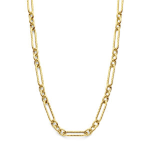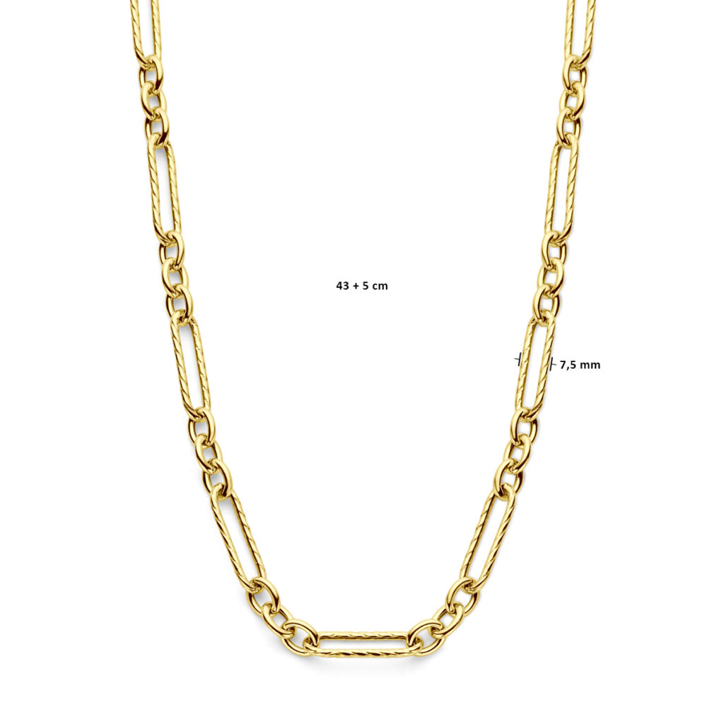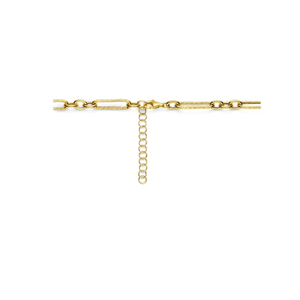 Geelgoud op 925 zilveren collier met een draaglengte van 43cm met 5cm extensie. Het collier heeft een schakelbreedte van 7.5mm en is uitgevoerd met karabijnsluiting.