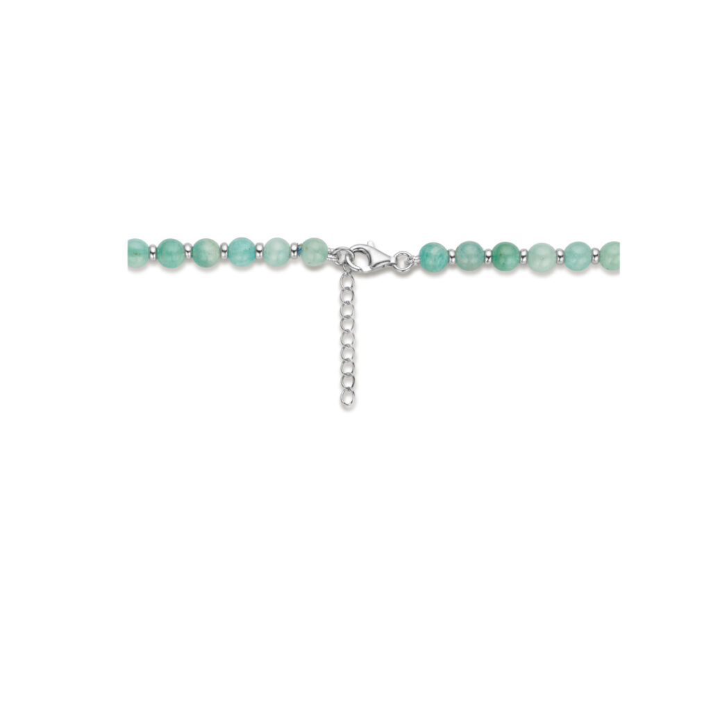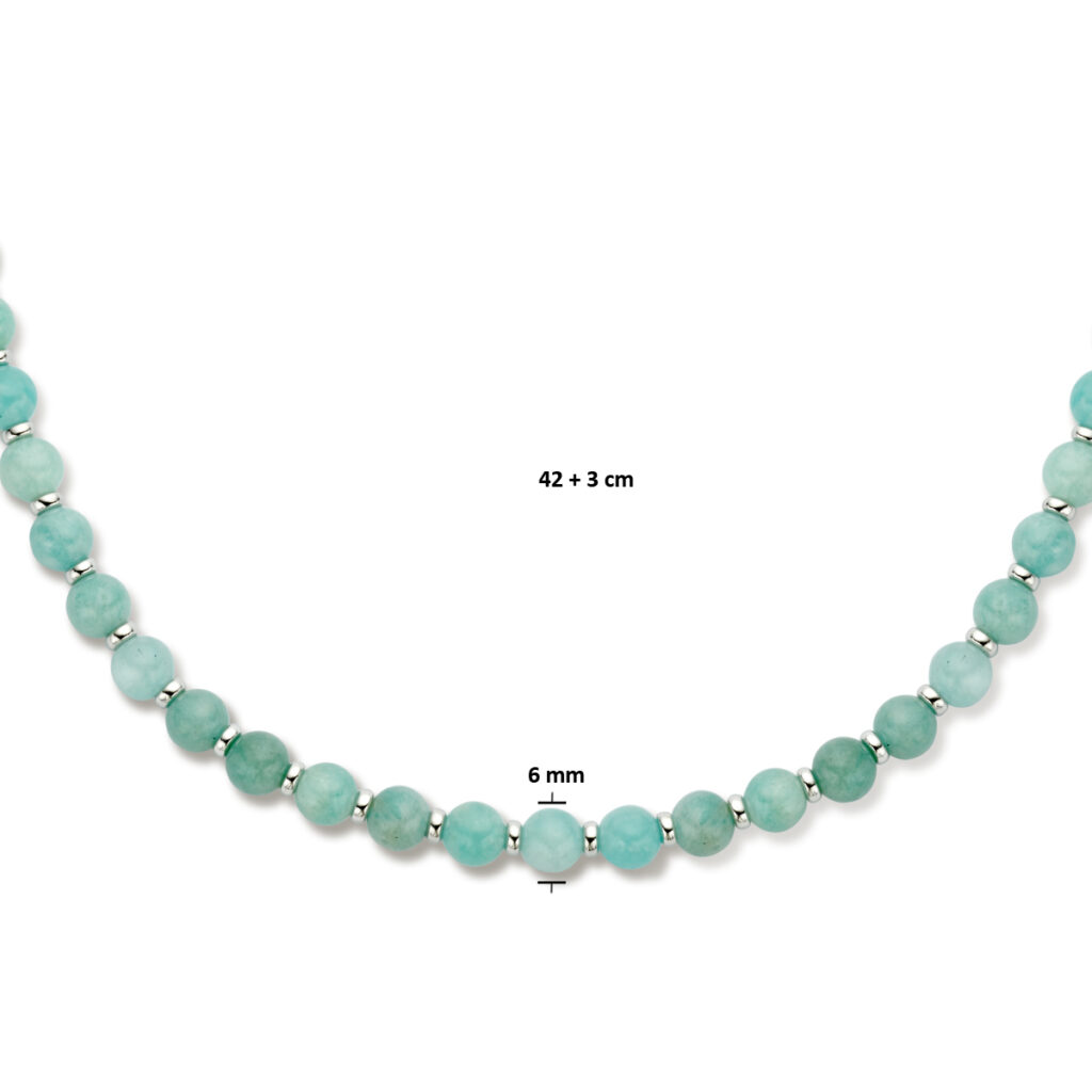 Gerhodineerd 925 zilveren collier met amazoniet en ringetjes. Het collier heeft een draaglengte van 42cm en een extensie van 3cm. Uitgevoerd met een karabijn sluiting.
