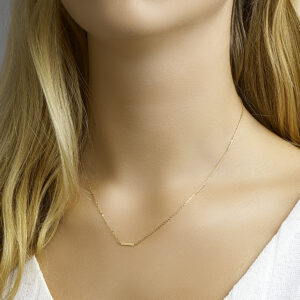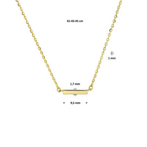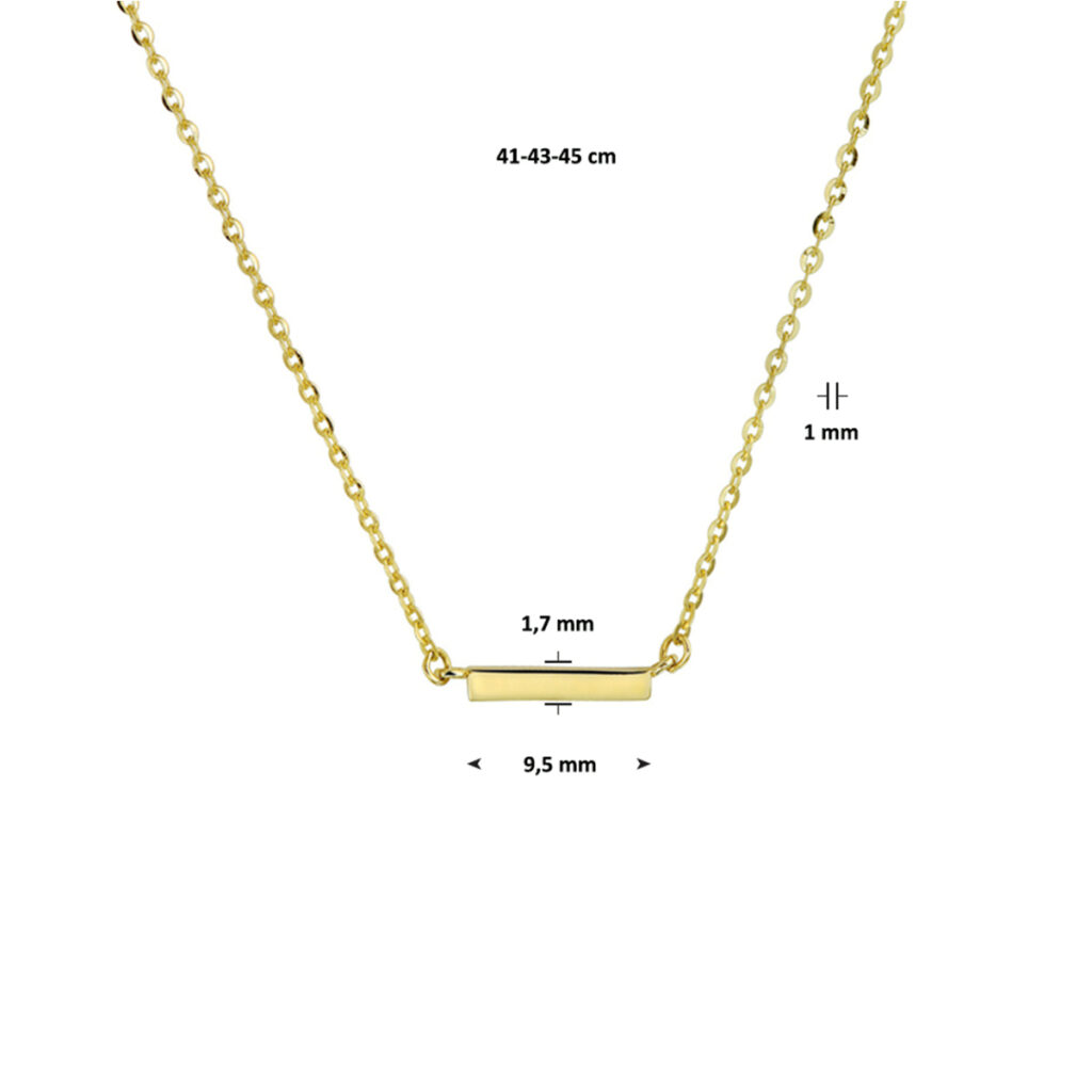 Dit verfijnde geelgouden collier is uitgevoerd met een stijlvol balkje als hanger. Het collier heeft draaglengtes van 41, 43 en 45 cm en een schakelbreedte van 1 mm, wat zorgt voor een elegante en subtiele uitstraling. Dit kettinghanger dames goud sieraad is perfect voor dagelijks gebruik en laat zich moeiteloos combineren met andere gouden sieraden voor een moderne, minimalistische look.