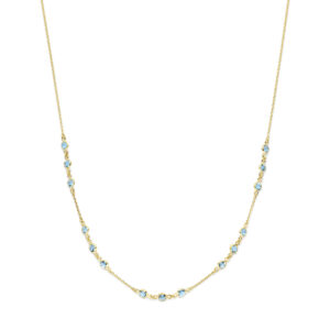 Geelgoud op 925 zilveren collier uitgevoerd met blauw topaas. Het collier heeft een schakelbreedte van 1.2mm en een draaglengte van 45cm. Geen garantie op de plating.
