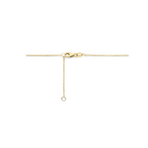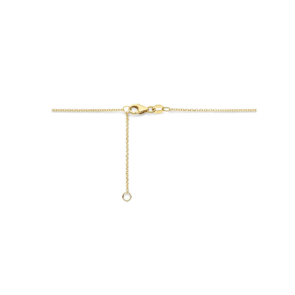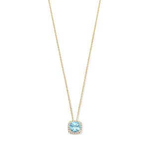 14k Geelgouden collier uitgevoerd met blauw topaas en diamant. De collier heeft draaglengtes van 42 en 45 cm en een karabijnsluiting.