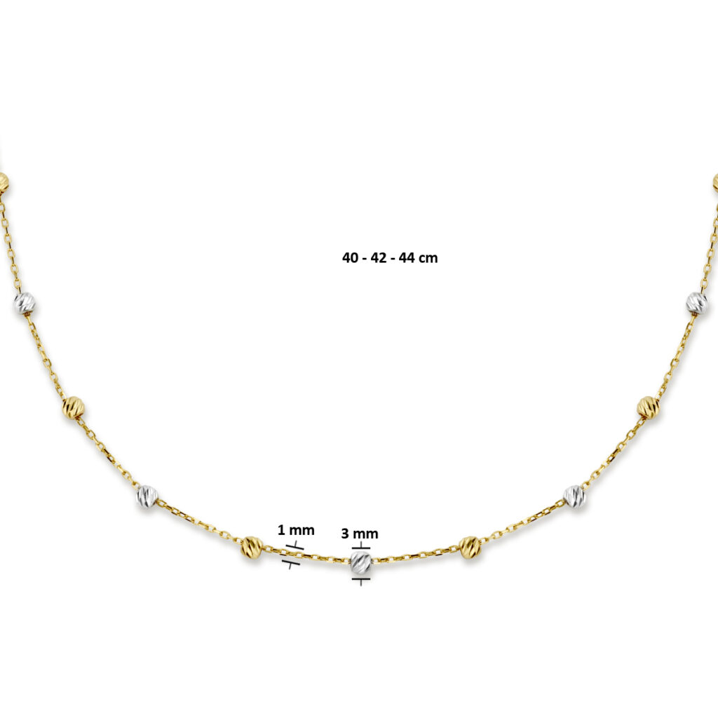 14k Bi-color wit- en geelgouden collier met een schakelbreedte van 1mm. Uitgevoerd met gediamanteerde bolletjes van 3mm. Het collier heeft draaglengtes van 40, 42 en 44cm.