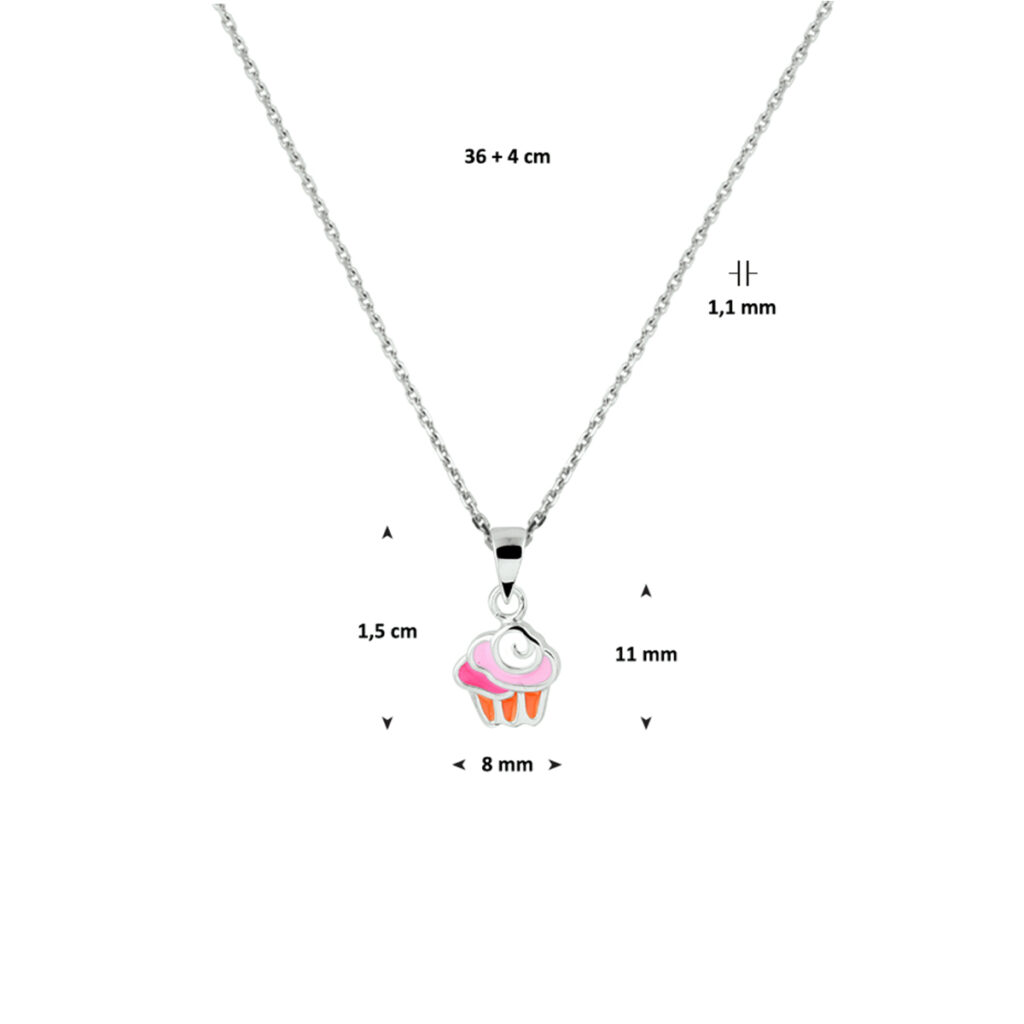 Super leuk gerhodineerd zilveren collier met cupcake hanger in verschillende kleuren emaille. De hanger heeft een afmeting van 15x8mm. En het collier heeft een draaglengte van 36cm met een extensie van 4cm. De schakelbreedte is 1.1mm. Tip: Leuk om kado te geven! Zie je ze al stralen?