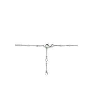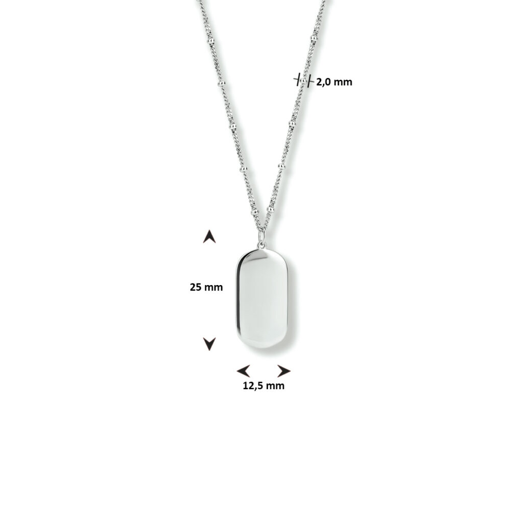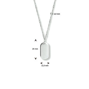 Dit leuke collier is gemaakt van 925 sterling zilver, de allerbeste kwaliteit zilver. Het sieraad is gepolijst en voorzien van een laagje rhodium, wat ervoor zorgt dat de glans extra lang behouden blijft. Het collier bestaat uit fijne schakels die mooi op elkaar aansluiten, met daartussen stijlvolle bolletjes. Deze hebben een breedte van 2 mm. Aan de voorkant is het collier voorzien van een dog tag. Deze heeft een afmeting van 25 mm x 12,5 mm. Aan de achterkant zit een stevige karabijn sluiting, hiermee kunt u het sieraad gemakkelijk om- en afdoen. Het is ook mogelijk om het collier in lengte te verstellen, dit kan van 40, 42 en 44 cm. Dit leuke collier kan ook gecombineerd worden met de bijpassende armband, zo creëert u eenvoudig een perfect setje. (13.33604)