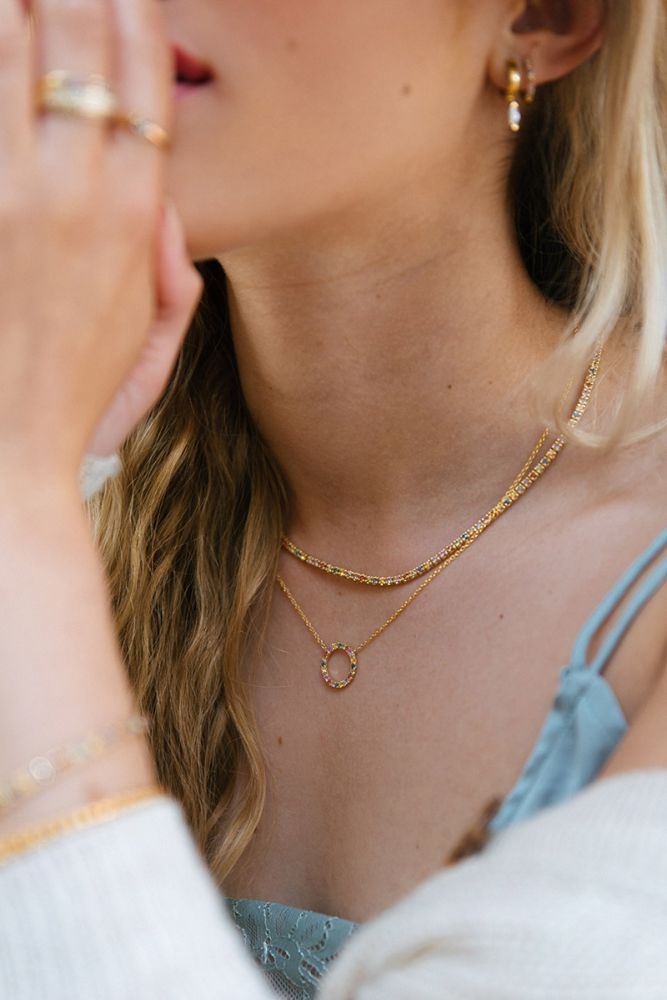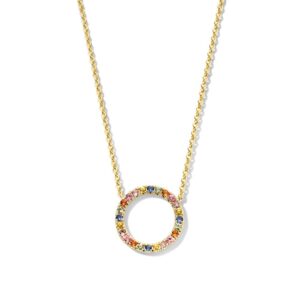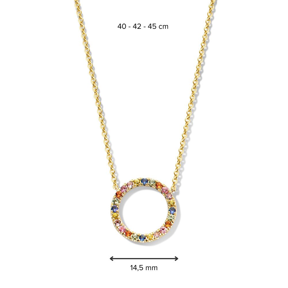 Dit collier is afkomstig van het merk Excellent Jewelry dat alweer 25 jaar een toonaangevende Nederlandse sieradenleverancier en vaste partner van vele Nederlandse juweliershuizen is. Dit collier is gemaakt van goud van de allerbeste kwaliteit en bestaat uit meerdere slanke schakels die fijntjes op elkaar aansluiten en die samen een stijlvol geheel vormen, met aan de voorkant een opengewerkte cirkel die aan de voorkant voorzien is van meerdere regenboog saffier edelstenen die mooi glinsteren en die voor een kleurrijk geheel zorgen. Aan de achterkant is het collier voorzien van een handige karabijnsluiting, waardoor u deze gemakkelijk om- en afdoet. Het collier heeft een gewicht van 2,9 gram met een maximale lengte van 45cm en een breedte van 2mm.