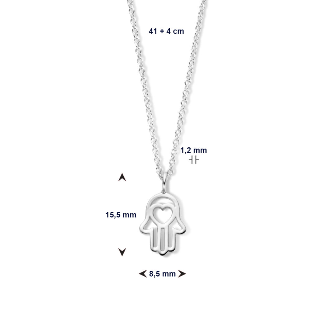 Prachtige gerhodineerd Zilveren Collier met Handje van Fatima en Hart 41 + 4 cm is vervaardigd uit 925 Sterling zilver dat is voorzien van een gerhodineerde coating. De Zilveren Collier met Handje van Fatima en Hart 41 + 4 cm bestaat uit een ketting van anker schakels met een schakelbreedte van 1,2 mm met daaraan een opengewerkte Fatima Hand en Hart met een hoogte van 15,5 mm en een breedte van 8,5 mm, die is voorzien van een contour in hartvorm. De draaglengte van deze collier is 41 cm met een extensie van 4 cm. De collier heeft een metaalgewicht van circa 2,12 gram en is uitgevoerd met een karabijnsluiting.