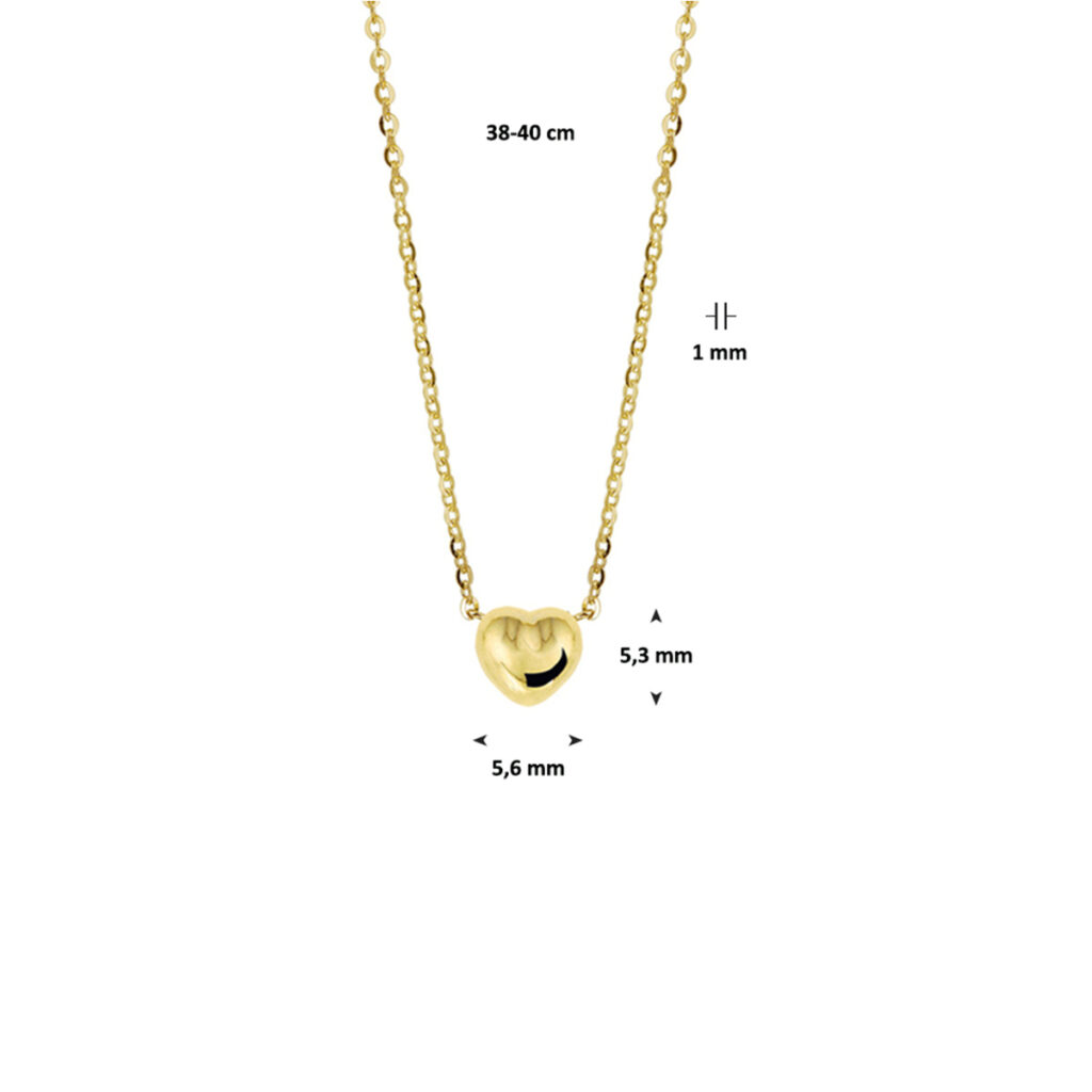 Dit Slanke Anker Collier van Geelgoud met Bolstaande Harthanger is volledig gemaakt van 14 karaats geelgoud, de allerbeste kwaliteit geelgoud, met een gepolijst oppervlak. Dit collier heeft een lengte van 40cm en de hanger heeft een breedte van 5,6mm met een hoogte van 5,3mm. Dit sieraad bestaat uit een slanke anker ketting met meerdere schakels die fijntjes op elkaar aansluiten, met onderaan een bolstaande harthanger die mooi glanst. Dit collier is voorzien van een fijntjes gepolijst oppervlak dat mooi glanst, met aan de achterkant een handige sluiting, waarmee u dit collier gemakkelijk om- en afdoet. Deze hanger is geschikt voor dames en is bijzonder leuk als cadeau. Dit sieraad zal tevens niet misstaan op bijvoorbeeld een luxe gala of een black-tie event. Deze hanger behoort tot onze huiscollectie, waardoor u verzekerd bent van de allerbeste kwaliteit tegen de scherpste prijs!