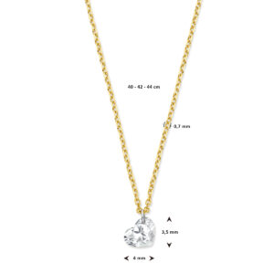 18k Geelgouden collier uitgevoerd met een diamant in de vorm van een hart. De draaglengtes zijn 40, 42 en 44cm. De schakelbreedte is 0.7mm. Het collier heeft een karabijn sluiting.