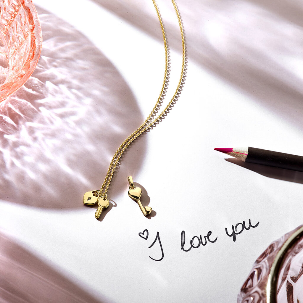Geelgoud op 925 zilveren collier uitgevoerd met een hart en een sleutel. Het collier heeft een draaglengte van 41cm met een extensie van 4cm en een stevige karabijn sluiting. De schakelbreedte is 1.2mm. Geen garantie op plating.
