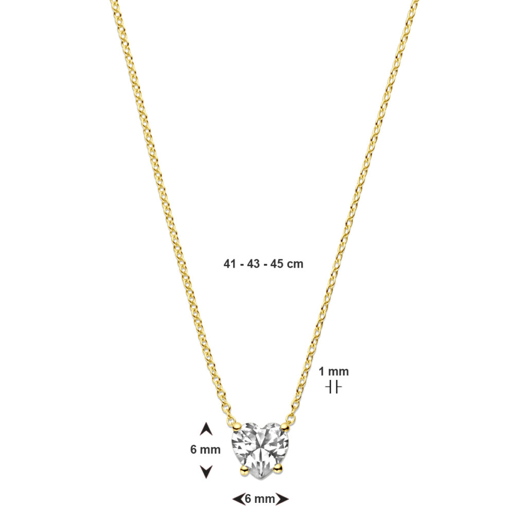 14k Geelgouden collier uitgevoerd met een hart zirkonia. Het collier heeft draaglengtes van 41, 43 en 45cm. Uitgevoerd met karabijn sluiting. De schakelbreedte is 1mm.