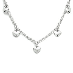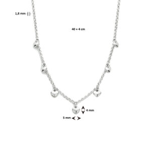 Dit prachtige collier is volledig gemaakt van 925 sterling zilver, de allerbeste kwaliteit zilver. Het sieraad heeft een fijntjes gepolijst oppervlak en is voorzien van een laagje rhodium, wat ervoor zorgt dat de glans extra lang behouden blijft. Het collier bestaat uit fijne jasseron schakels, die mooi op elkaar aansluiten en samen een stijlvol geheel vormen, uitgevoerd met meerdere hartjes. Dit zorgt voor een bijzonder leuk en uniek geheel! De hartjes hebben een afmeting van 4 x 5 mm. Verder heeft het collier een draaglengte van 40 cm met daaraan een verlengstukje van 4 cm, waardoor de totale lengte 44 cm bedraagt.