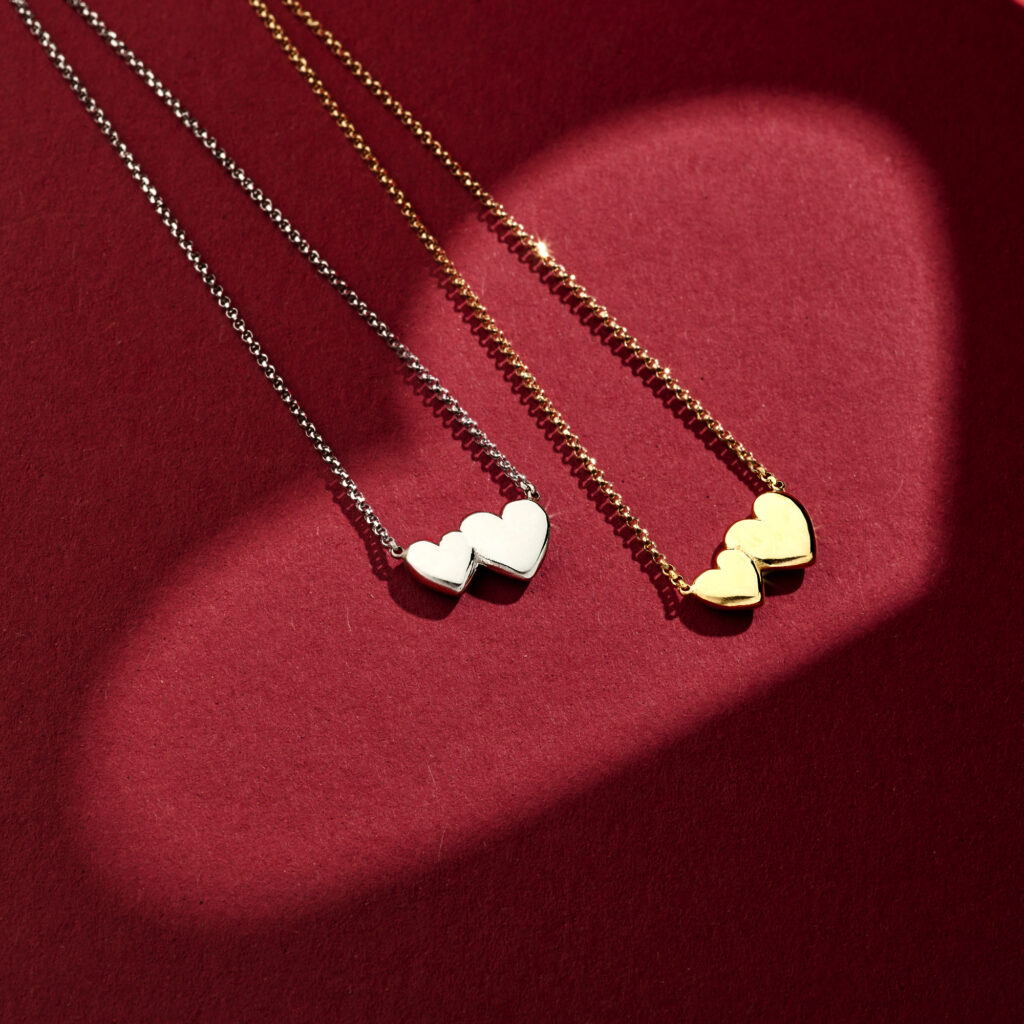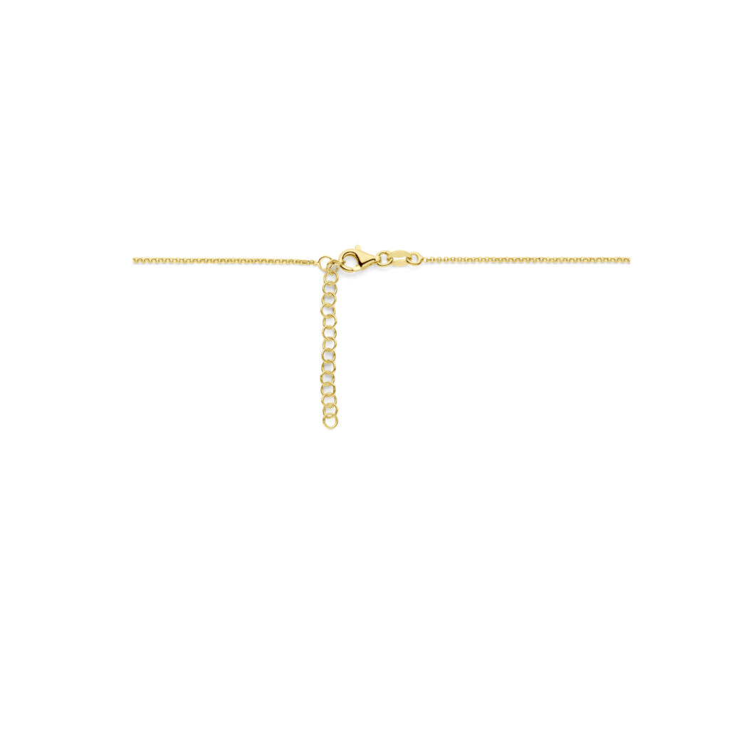 Geelgoud op 925 zilveren collier uitgevoerd met twee hartjes. Het collier heeft een schakelbreedte van 1.3mm en een draaglengte van 41cm met 4cm extensie.