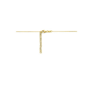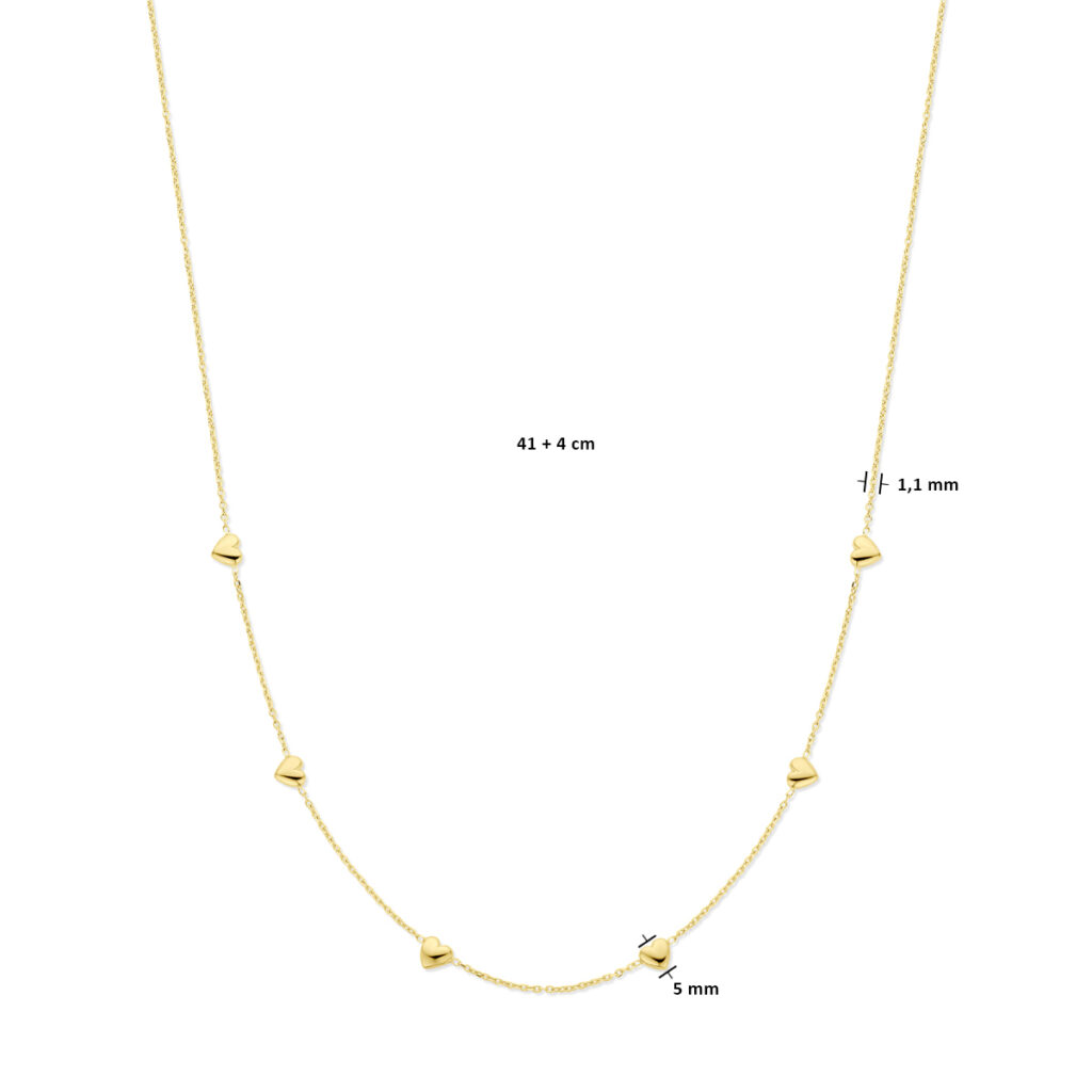 Geelgoud op 925 zilveren ketting met hartjes. Het collier heeft een schakelbreedte van 1.1mm en een draaglengte van 41cm met 4cm extensie.