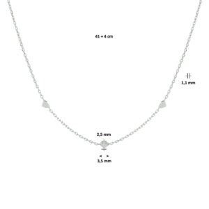 Dit anker collier is volledig gemaakt van 925 sterling zilver, de allerbeste kwaliteit zilver, en voorzien van een fijntjes gepolijst oppervlak dat mooi glanst. Dit collier bestaat uit meerdere anker schakels die fijntjes op elkaar aansluiten en die samen een stijlvol geheel vormen waar u niet snel op uitgekeken zult raken. Daarnaast is dit collier aan de voorkant voorzien van drie hartjes ter decoratie. Aan de achterkant zit een handige karabijnsluiting, waardoor u dit collier gemakkelijk om- en afdoet. Dit collier heeft een lengte van 45cm met een breedte van 3,5mm.