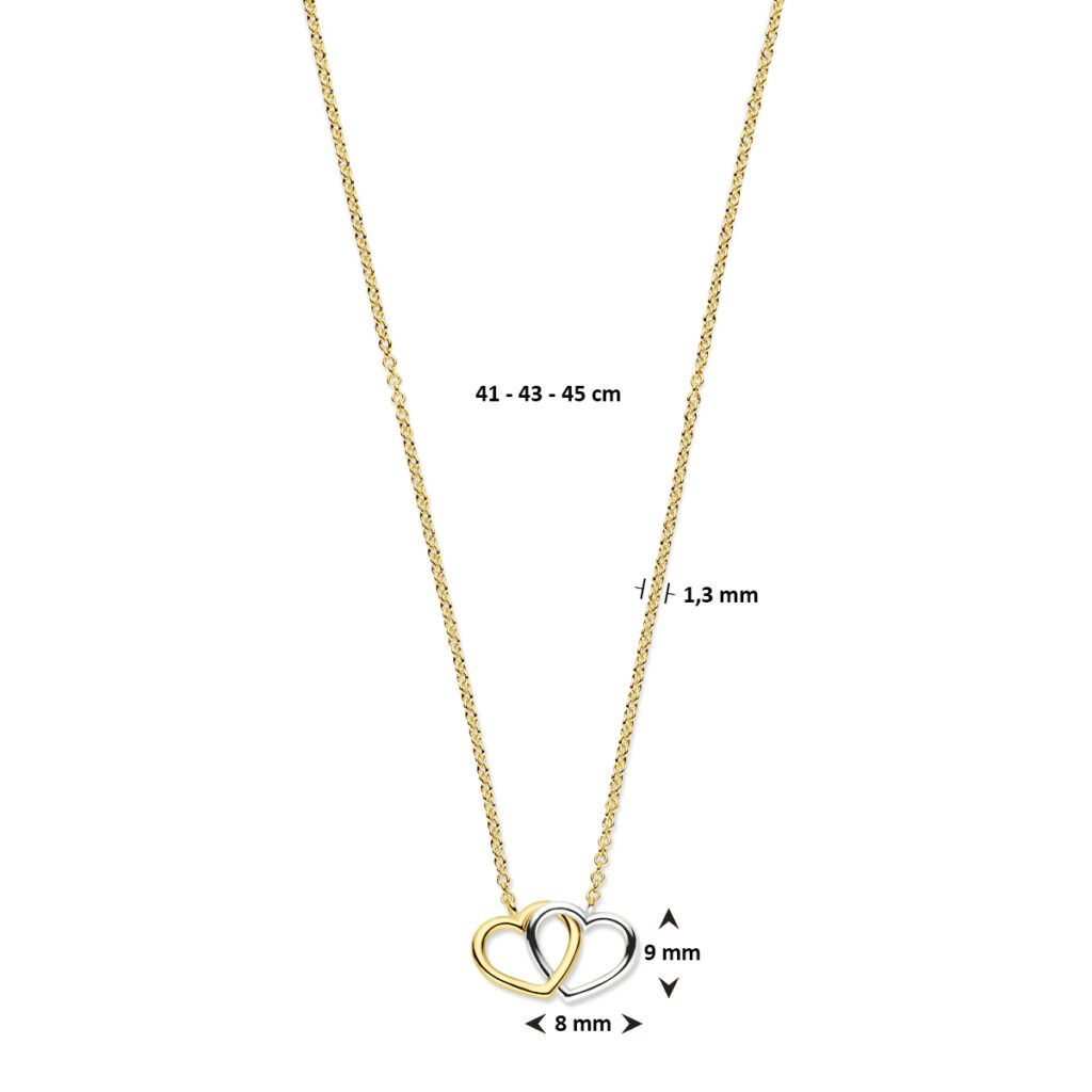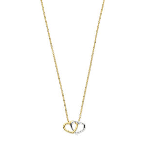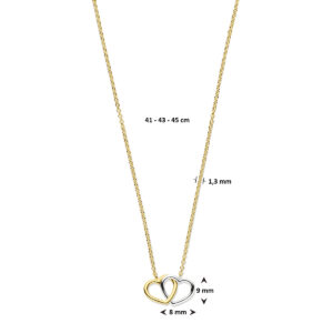 Dit bicolor dubbele hart collier is volledig gemaakt van 14-karaats goud, de allerbeste kwaliteit goud, met een gepolijst oppervlak. Dit kettinghanger dames goud collier heeft een lengte van 44 cm en de hangers hebben een breedte van 8 mm en een hoogte van 9 mm. Het sieraad bestaat uit een slanke ankerketting met meerdere opengewerkte schakels die fijntjes in elkaar haken, met onderaan twee opengewerkte hartvormige hangertjes die in elkaar haken. De linker hanger is gemaakt van geelgoud, de rechter van witgoud.