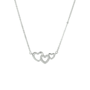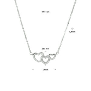 Romantisch gerhodineerd zilveren collier met hartjes en schitterende zirkonia. Met een draaglengte van 40cm en een extensie van 4cm uitgevoerd met een stevige karabijn sluiting. De schakelbreedte is 1.4mm. Tip: Leuk om kado te geven! Info: Gerhodineerd zilver is door de rhodiumlaag beter bestand tegen verkleuren en krassen.