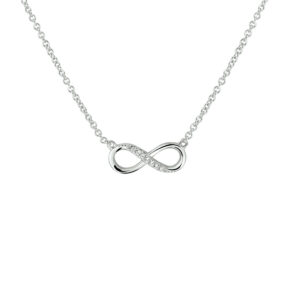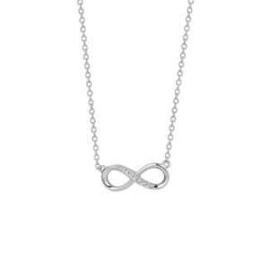 Gerhodineerd zilveren collier met infinity teken en zirkonia. Het collier is onderdeel van een set. De lengte van het collier bedraagt 41cm met 4cm extensie. De schakelbreedte bedraagt 1.2mm.
