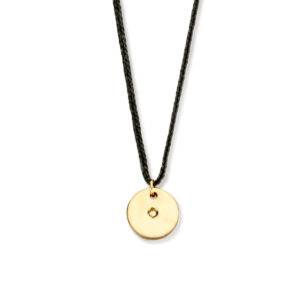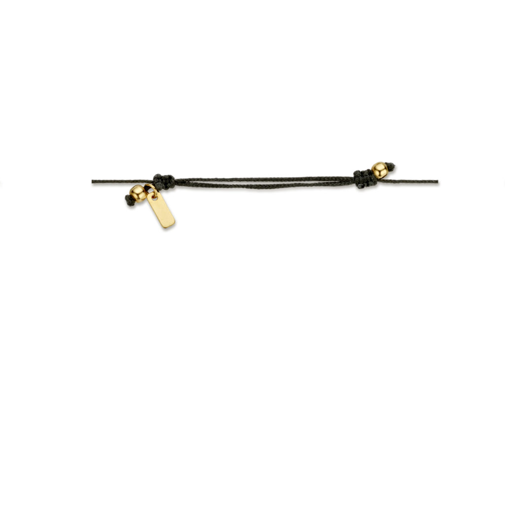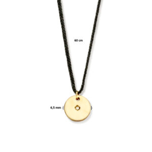 Zwart katoenen collier met 14k geelgouden elementen. Het rondje heeft een diameter van 6.5mm. Het collier is verstelbaar tot 60cm.