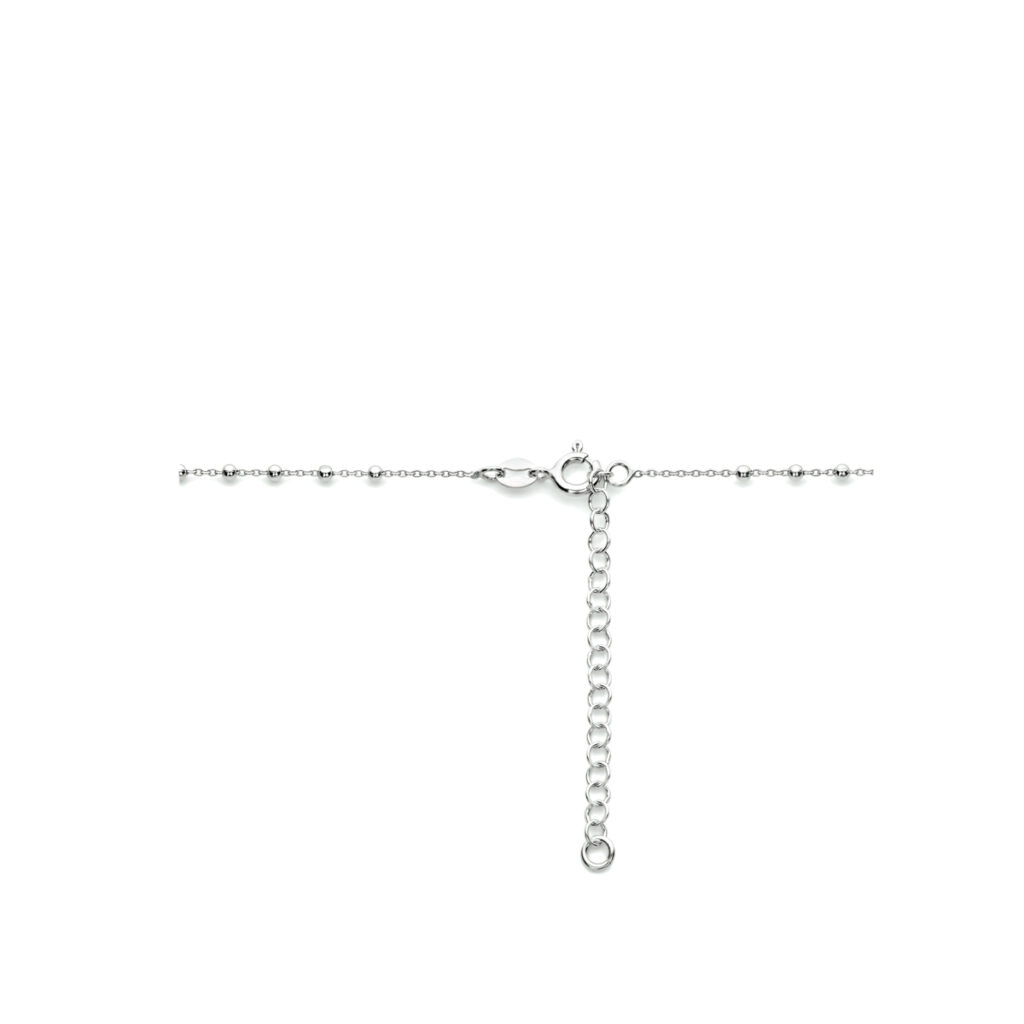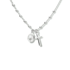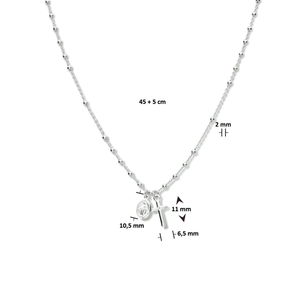 Deze kruis ketting vrouwen is uitgevoerd als een gerhodineerd 925 zilveren collier met een kruis en een scapulier. De kruisketting heeft een draaglengte van 45 cm, met een verlengstuk van 5 cm voor extra draagcomfort. De schakelbreedte bedraagt 2,0 mm, wat zorgt voor een stevige en elegante uitstraling.