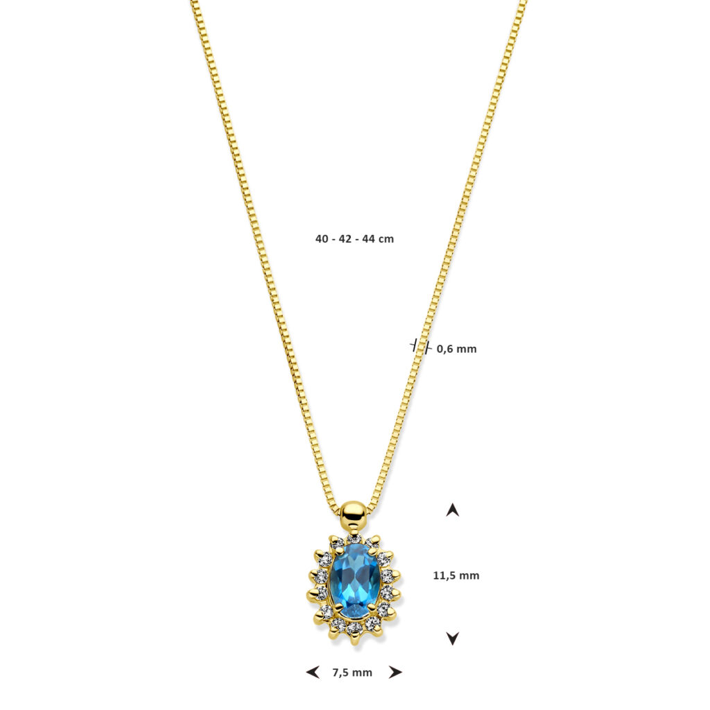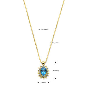 14k Geelgouden collier uitgevoerd met london blue topaas en diamant. Het collier heeft draaglengtes van 40-42-44cm en is uitgevoerd met karabijn sluiting. De schakelbreedte is 0.6mm. Het diamantgewicht is 0.11ct.