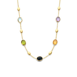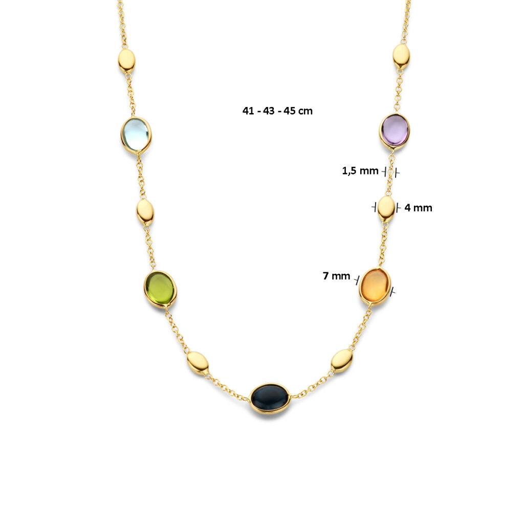 14k Geelgouden collier uitgevoerd met een karabijn sluiting en edelstenen zoals: peridot, blauw topaas, London blue topaas, citrien en amethist. Het collier heeft draalengtes van 41, 43 en 45cm. De schakelbreedte is 1.5mm.