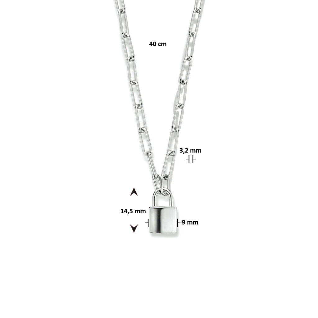 Gerhodineerd 925 zilveren paperclip collier uitgevoerd met een hanger in de vorm van een slotje. Het collier heeft een draaglengte van 40cm en een karabijn sluiting. De schakelbreedte is 3.2mm.