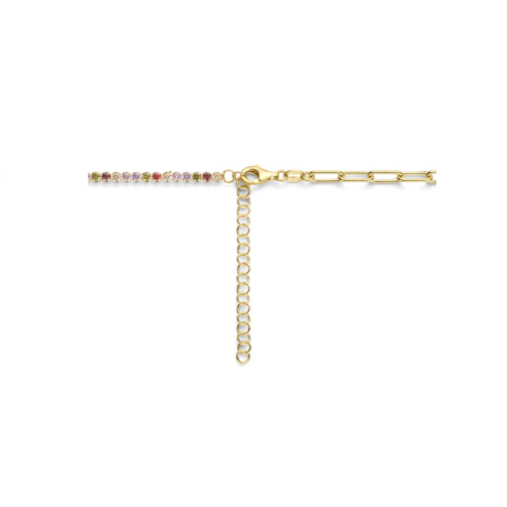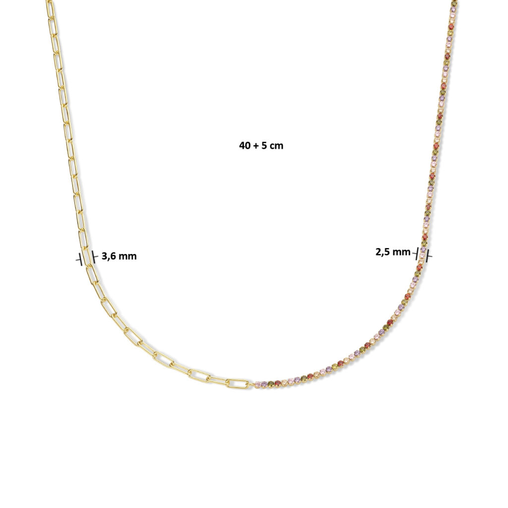 Geelgoud op 925 zilveren collier uitgevoerd met een paperclip schakel, gekleurd zirkonia en een karabijnsluiting. Het collier heeft een draaglengte van 40cm met een extensie van 5cm. De schakelbreedte is 3.6mm. Geen garantie op plating.