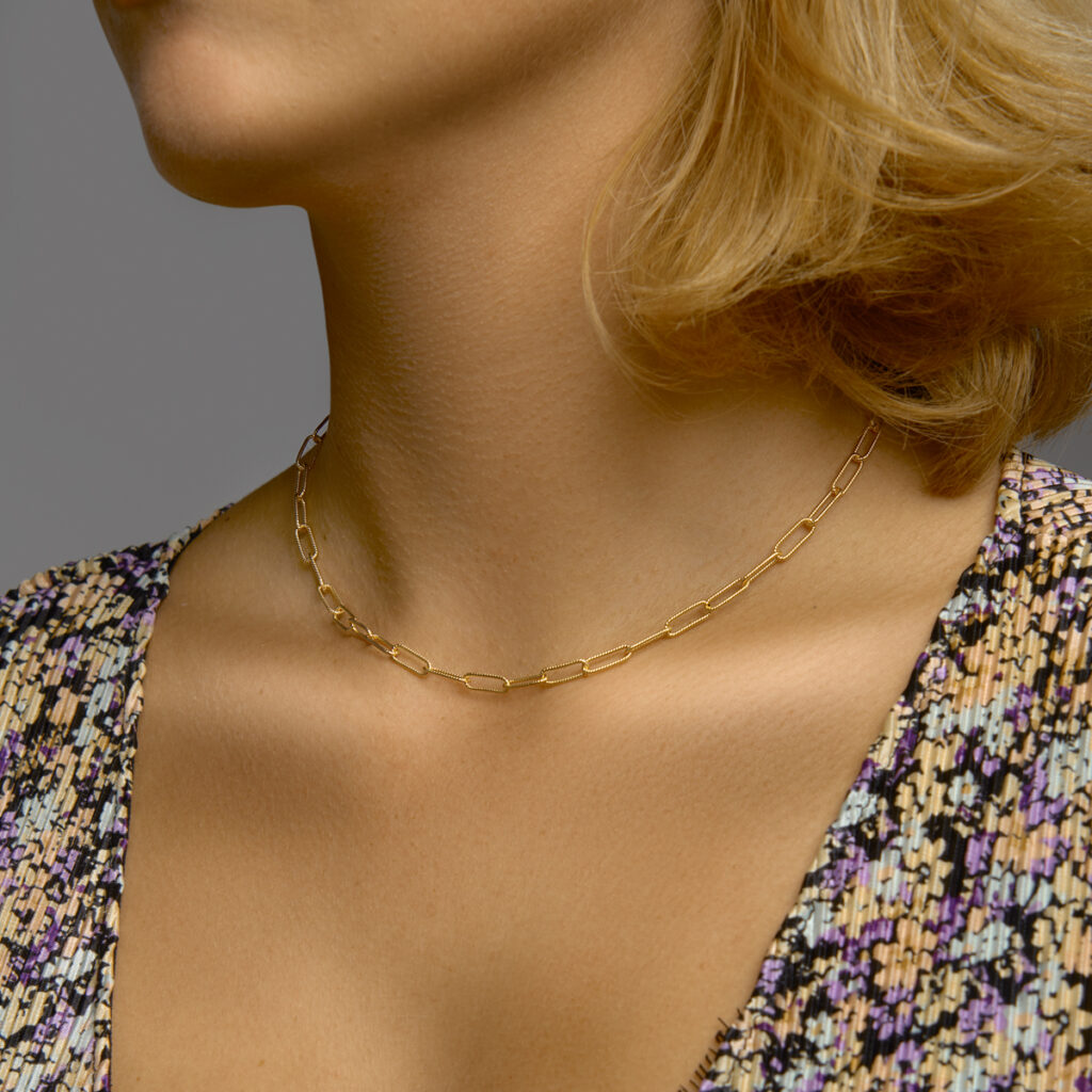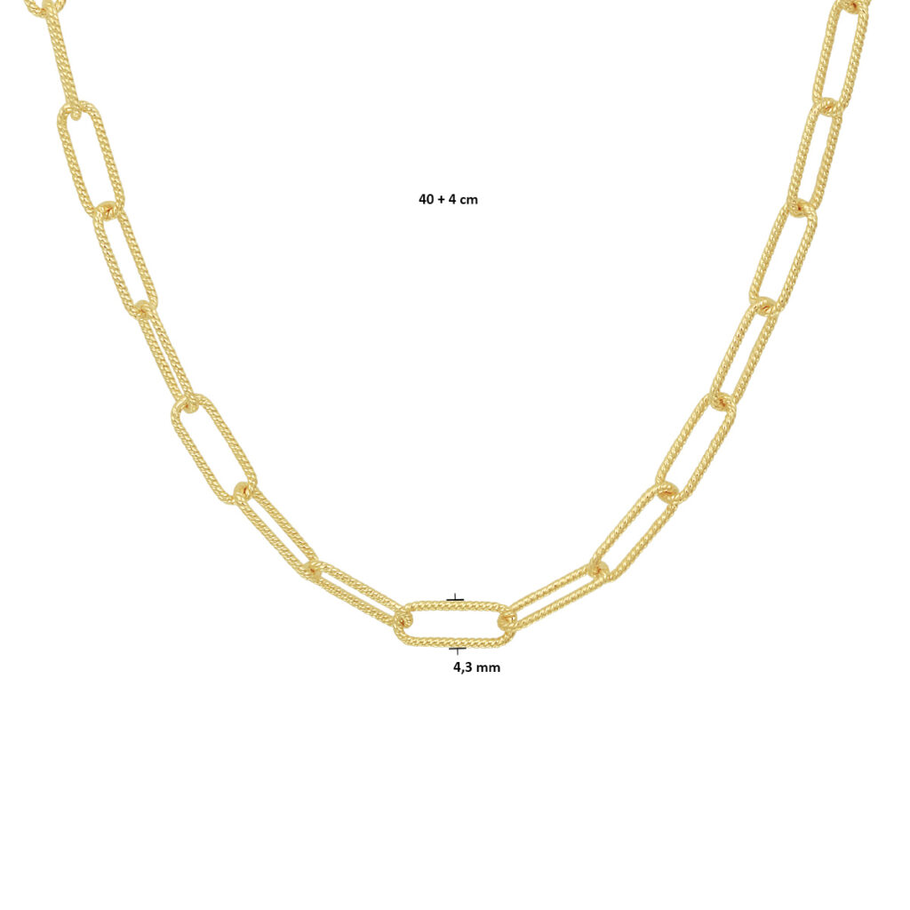Geelgoud op 925 zilveren paperclip collier met een schakelbreedte van 4.3mm. Het collier heeft een draaglengte van 40cm met een extensie van 4cm en een stevige karabijn sluiting.