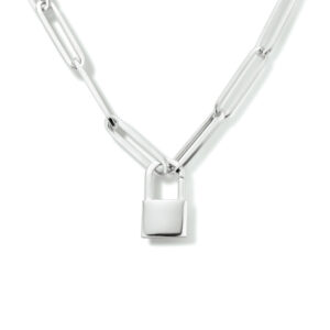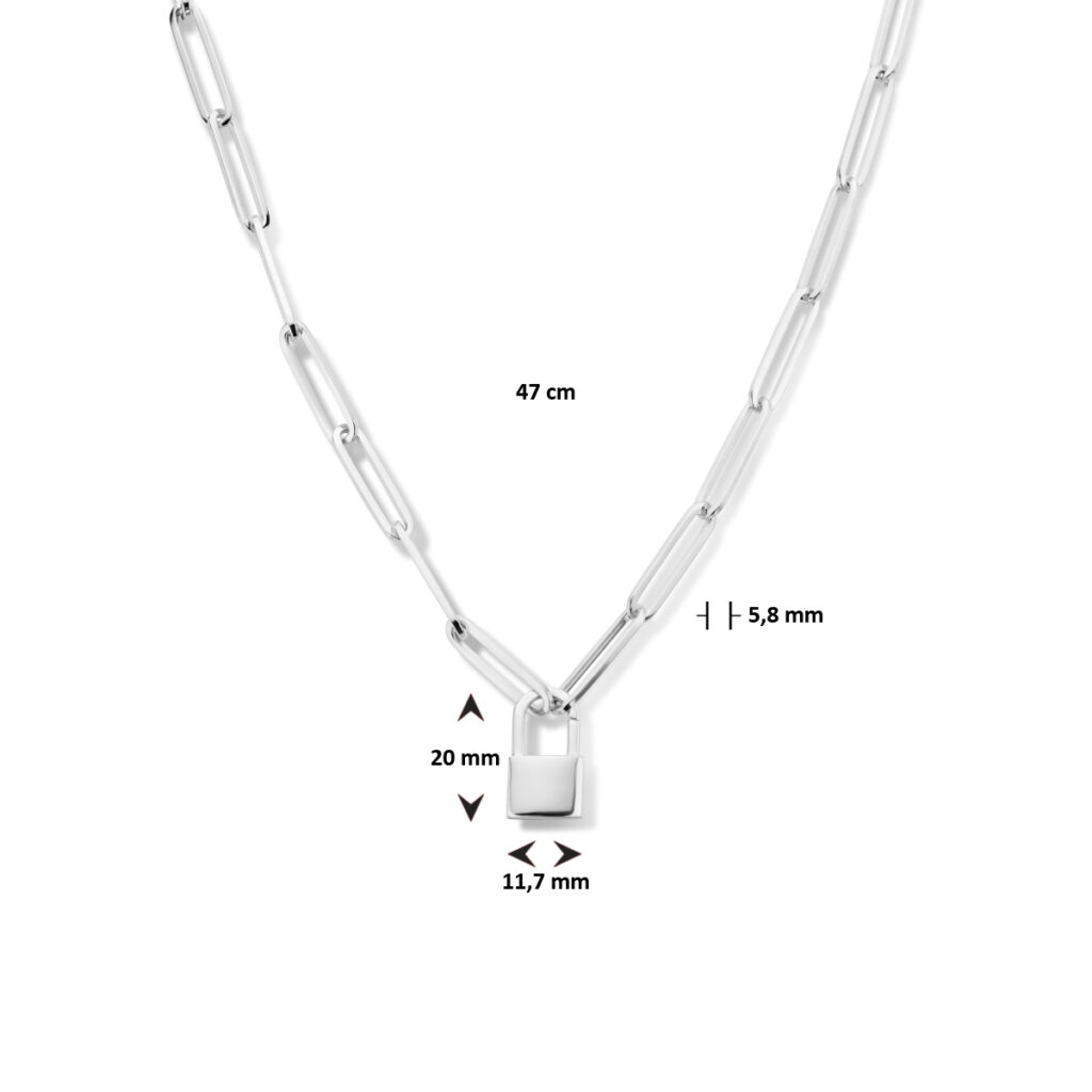 Gerhodineerd 925 zilveren paperclip collier uitgevoerd met een slotje. Het collier heeft een schakelbreedte van 5.8mm en een draaglengte van 47cm. Het slot heeft een afmeting van 20×11,7mm.