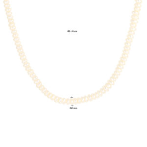 Dit prachtige collier is gemaakt van 925 sterling zilver, de allerbeste kwaliteit zilver. Het collier is voorzien van schitterende zoetwaterparels met een breedte van 4 mm. Aan de achterkant zit een stevige karabijn sluiting, waarmee u het sieraad eenvoudig om- en af kunt doen. Het collier heeft een draaglengte van 41 cm met daaraan een verlengstukje van 4 cm, waardoor de totale lengte 45 cm bedraagt.
