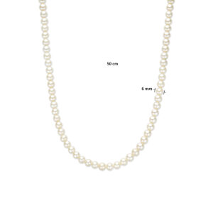 Deze parelketting met Witte Zoetwaterparels is volledig gemaakt van 14 karaats geelgoud, de allerbeste kwaliteit geelgoud, met een gepolijst oppervlak en meerdere zoetwaterparels. Dit collier heeft een lengte van 50cm met een breedte van 6mm. Dit sieraad bestaat uit een slanke strook geelgoud die volledig bedekt is met meerdere witte zoetwaterparels die mooi glanzen. Dit collier is voorzien van een fijntjes gepolijst oppervlak dat mooi glanst, met aan de achterkant een handige sluiting, waarmee u dit collier gemakkelijk om- en afdoet. Deze hanger is geschikt voor dames en is bijzonder leuk als cadeau. Dit sieraad zal tevens niet misstaan op bijvoorbeeld een luxe gala of een black-tie event. Deze hanger behoort tot onze huiscollectie, waardoor u verzekerd bent van de allerbeste kwaliteit tegen de scherpste prijs!
