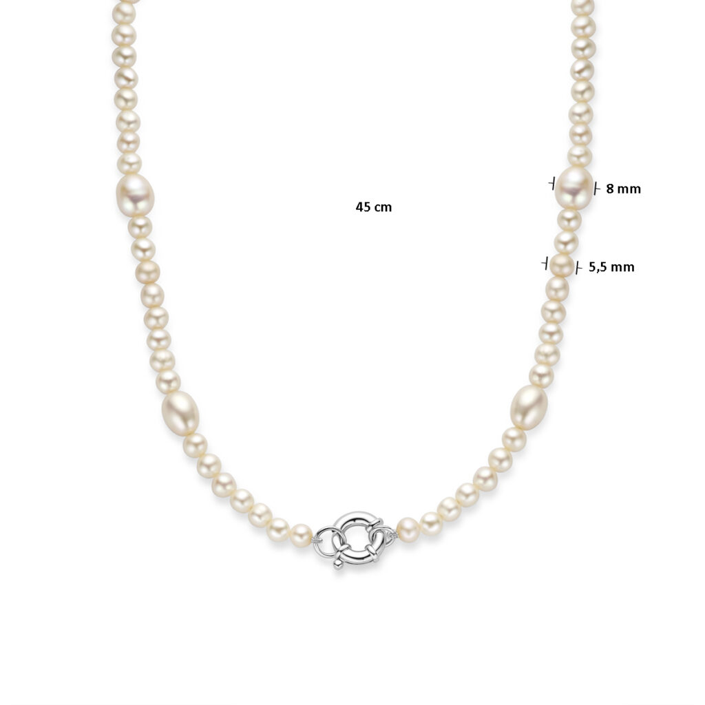 Gerhodineerd 925 zilveren collier uitgevoerd met zoetwaterparels en een groot veerslot. Het collier heeft een draaglengte van 45cm.