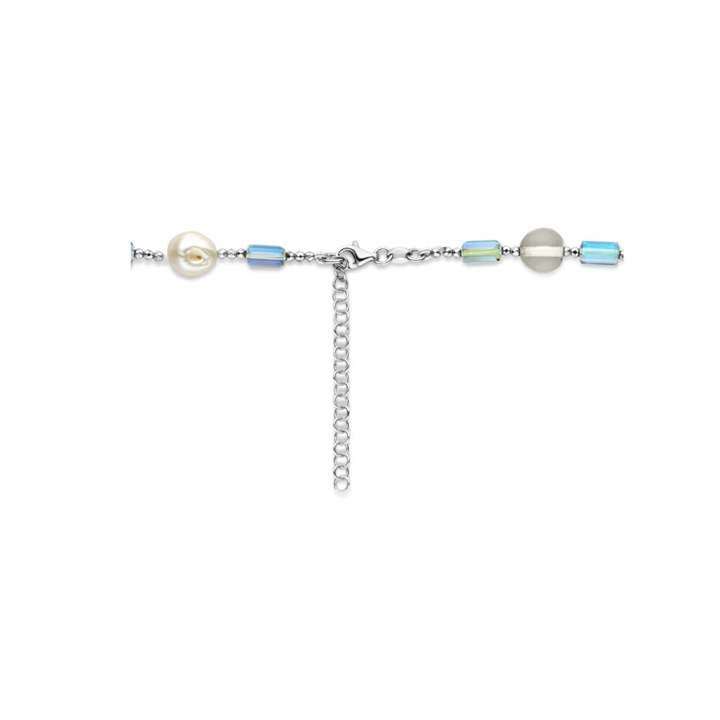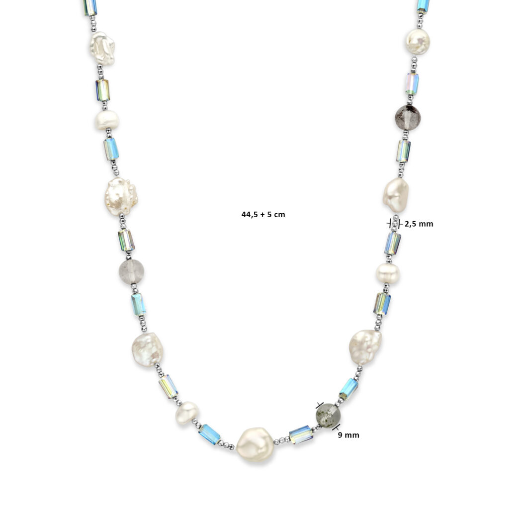 Gerhodineerd 925 zilveren collier uitgevoerd met zoetwaterparels en agaat stenen. Het collier heeft een draaglengte van 44.5cm met 5cm extensie. Uitgevoerd met karabijnsluiting.