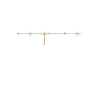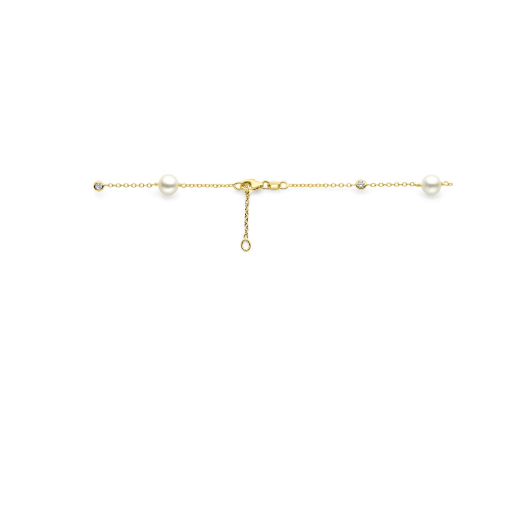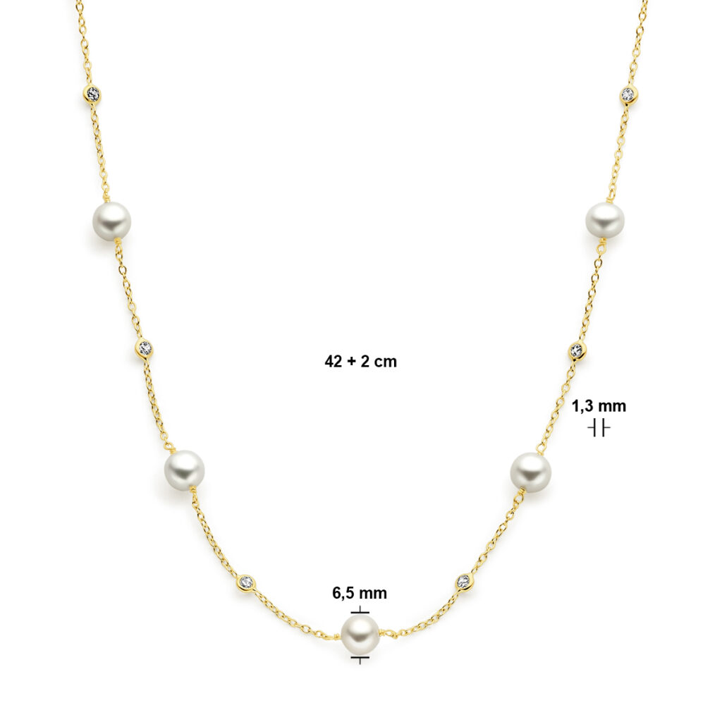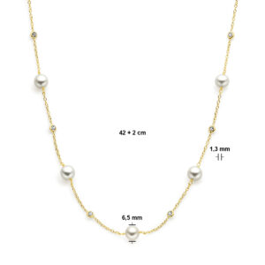 14k Geelgouden collier uitgevoerd met zoetwaterparels, zirkonia en een karabijn sluiting. De collier heeft draaglengte van 42 en 44cm . De schakelbreedte is 1.3mm.