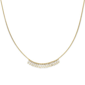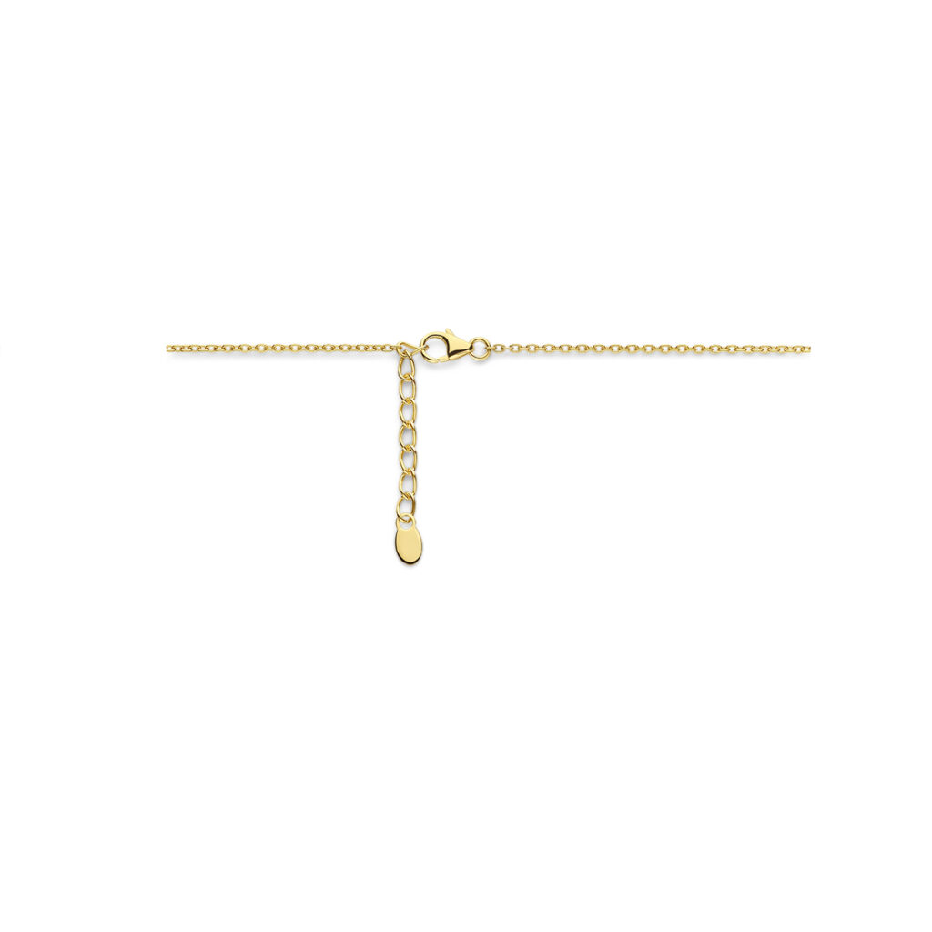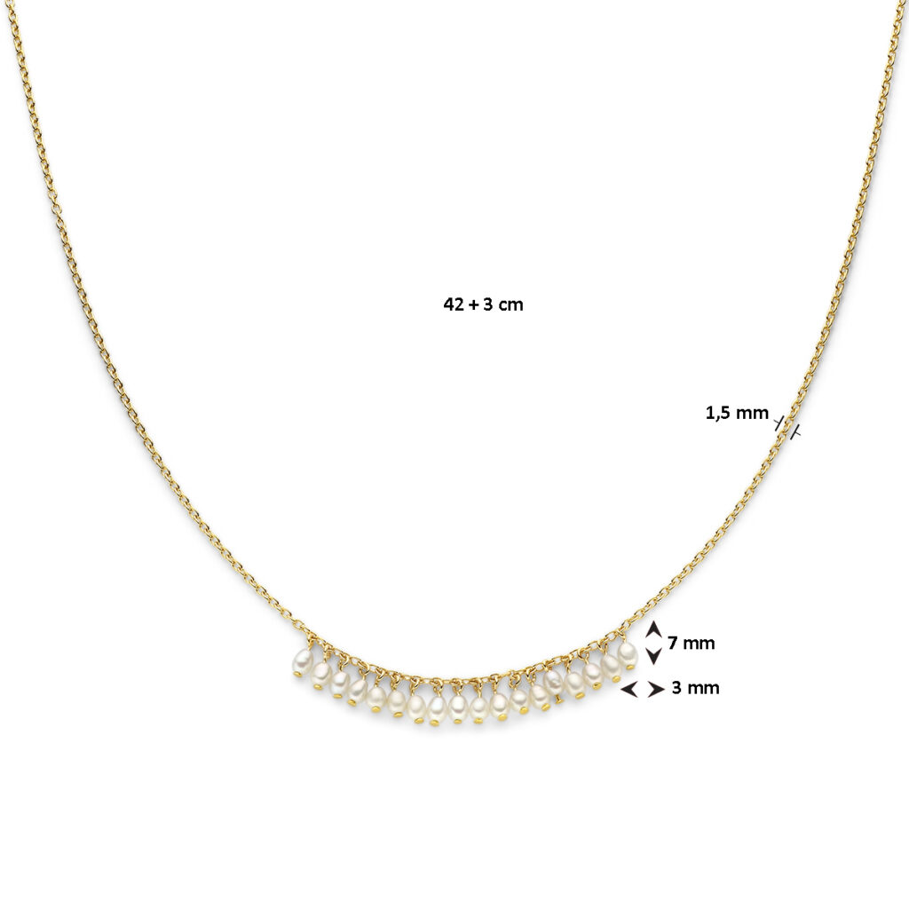Geelgoud op 925 zilveren collier uitgevoerd met zoetwaterparels. Het collier heeft een draaglengte van 42cm en een extensie van 3cm. De schakelbreedte is 1.5mm. Geen garantie op plating.