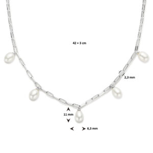 Gerhodineerd 925 zilveren collier met zoetwaterparels. Het collier heeft een draaglengte van 42cm en een extensie van 3cm. De schakelbreedte is 2.3mm. Uitgevoerd met een karabijn sluiting.