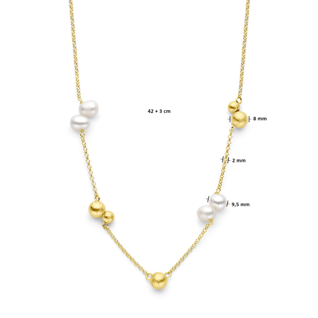 Geelgoud op 925 zilveren collier uitgevoerd met zoetwaterparels en bolletjes. Het collier heeft een draaglengte van 42cm met 3cm extensie. Uitgevoerd met karabijnsluiting. De schakelbreedte is 2.0mm. Geen garantie op de plating.