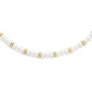 Geelgoud op 925 zilveren collier uitgevoerd met schitterende zoetwaterparels. Het collier heeft een draaglengte van 41cm met 5cm extensie en is uitgevoerd met een karabijnsluiting. Geen garantie op plating.