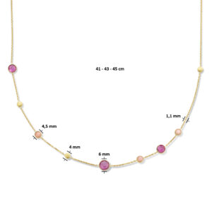 14k Geelgouden collier uitgevoerd met robijn en roze opaal stenen. Het collier heeft draaglengtes van 41, 43 en 45cm. De schakelbreedte is 1.1mm.