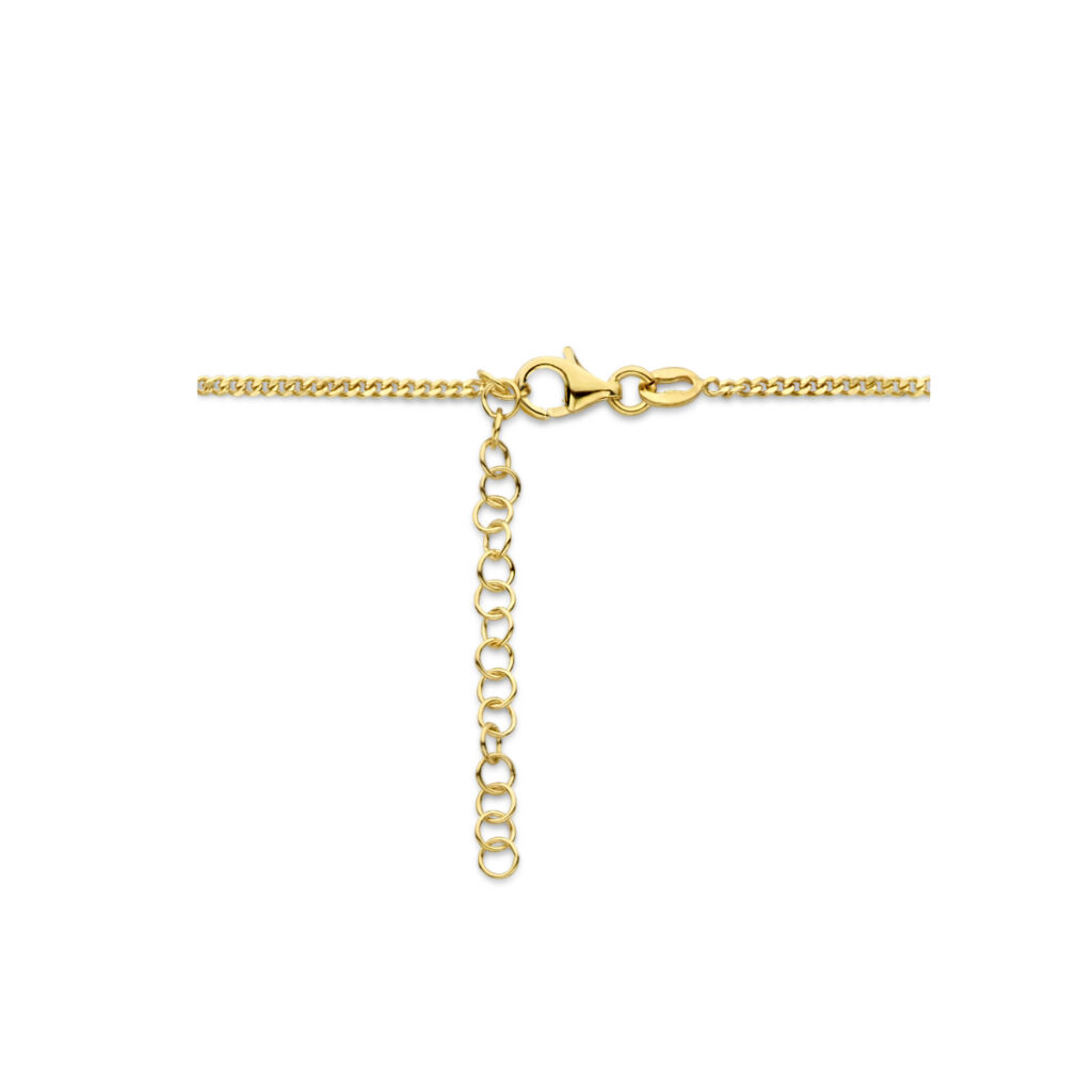 Geelgoud op 925 zilveren collier uitgevoerd met een ronde hanger en een karabijn sluiting. Het collier heeft een draaglengte van 40cm met een extensie van 4cm. De schakelbreedte is 1.7mm.