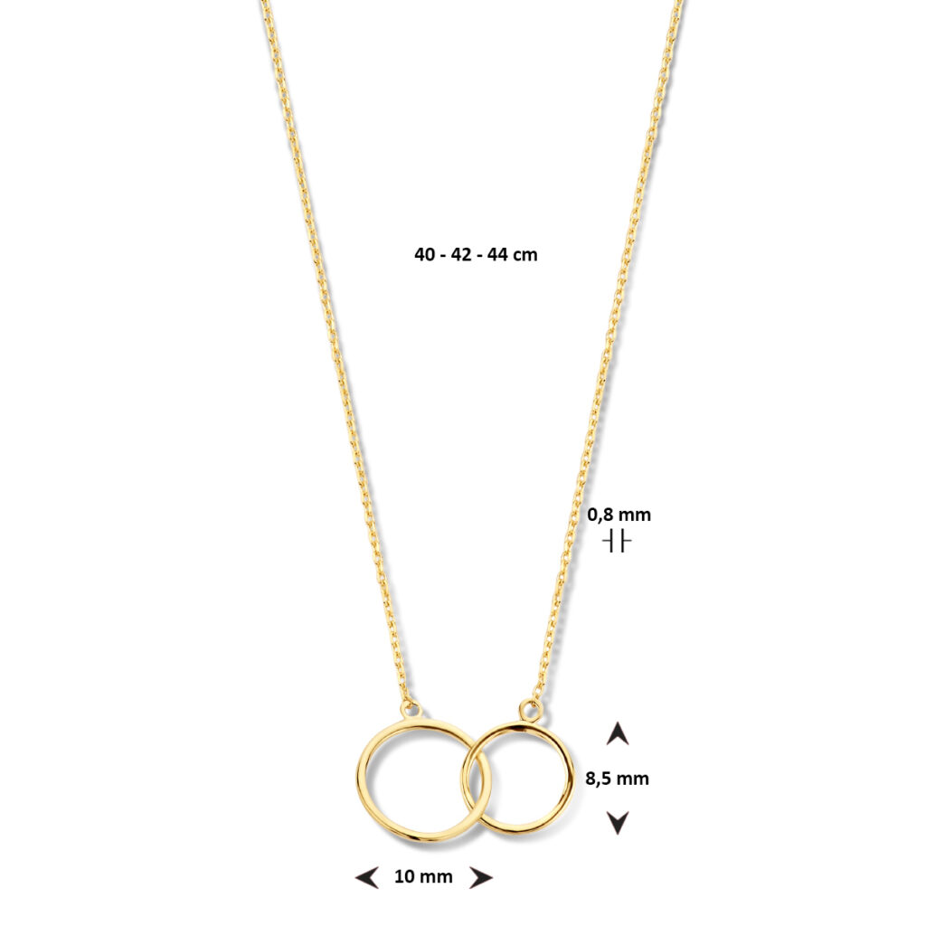 Dit Slanke Anker Collier van Geelgoud met Dubbele Opengewerkte Cirkelhanger is volledig gemaakt van 14 karaats geelgoud, de allerbeste kwaliteit geelgoud, met een gepolijst oppervlak. Dit collier heeft een lengte van 44cm met een breedte van 0,8mm. Dit sieraad bestaat uit een slanke anker ketting met meerdere opengewerkte schakels die fijntjes op elkaar aansluiten, met onderaan twee opengewerkte cirkels die verschillen in grootte en door elkaar haken. Dit collier is voorzien van een fijntjes gepolijst oppervlak dat mooi glanst, met aan de achterkant een handige sluiting, waarmee u dit collier gemakkelijk om- en afdoet. Deze hanger is geschikt voor dames en is bijzonder leuk als cadeau. Dit sieraad zal tevens niet misstaan op bijvoorbeeld een luxe gala of een black-tie event. Deze hanger behoort tot onze huiscollectie, waardoor u verzekerd bent van de allerbeste kwaliteit tegen de scherpste prijs!